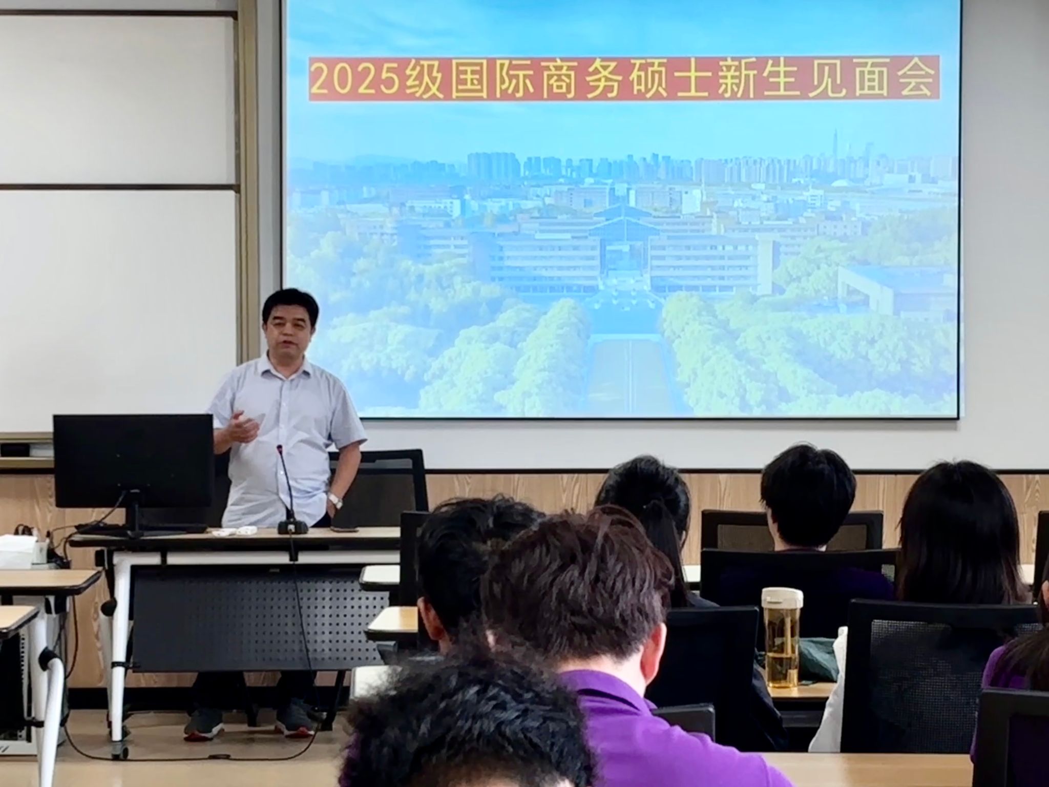 314教室顺利举行。本次见面会旨在帮助2025级新生明确学习目标、规划研究生生涯,为未来两年半的学习与研究奠定基础。学位点负责人杨丽华教授、MIB教育中心执行主任叶劲松老师与全体国际商务硕士新生面对面,帮助新生从入学第一天起“看见2028”,科学规划研究生阶段的学习、科研与职业发展。