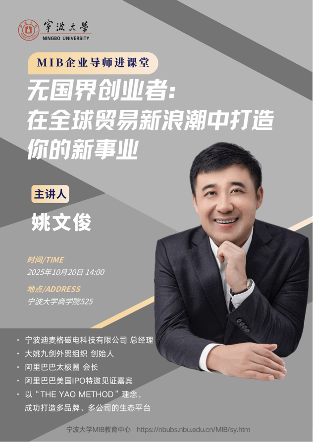 525阶梯教室,2025级国际商务专硕迎来了一场题为“无国界创业者:在全球贸易新浪潮中打造你的新事业”的专题讲座。本次讲座由MIB教育中心主办,校外导师、宁波迪麦格磁电科技有限公司总经理姚文俊走进MIB《国际贸易政策与实务》课堂,为师生带来了一场融合个人创业经历与全球贸易洞察的精彩分享。