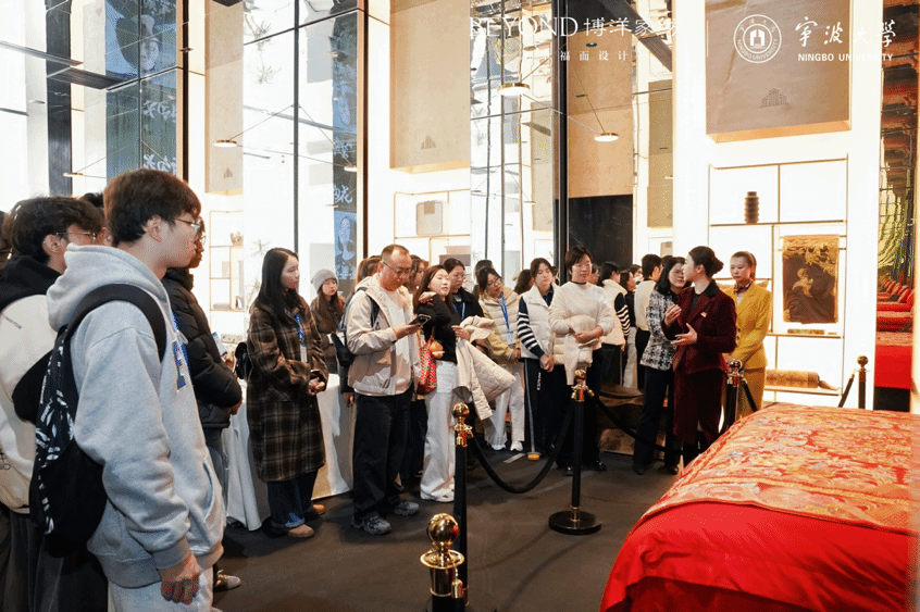 在产品展示环节,师生们近距离感受了博洋家纺融合中国传统文化与现代美学的设计语言。从极简线条中营造的晨光意境,到苏绣工艺中细腻的丝线渐变;从婚庆系列中寓意“龙凤呈祥”、“麒麟送子”的传统图样,到融合金银丝、水波纹提花等现代工艺的时尚套件——每一件产品都凝聚着博洋对“中国制造”走向“中国创造”的执着追求。