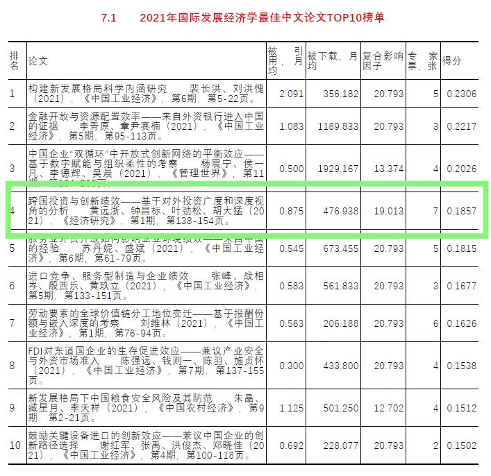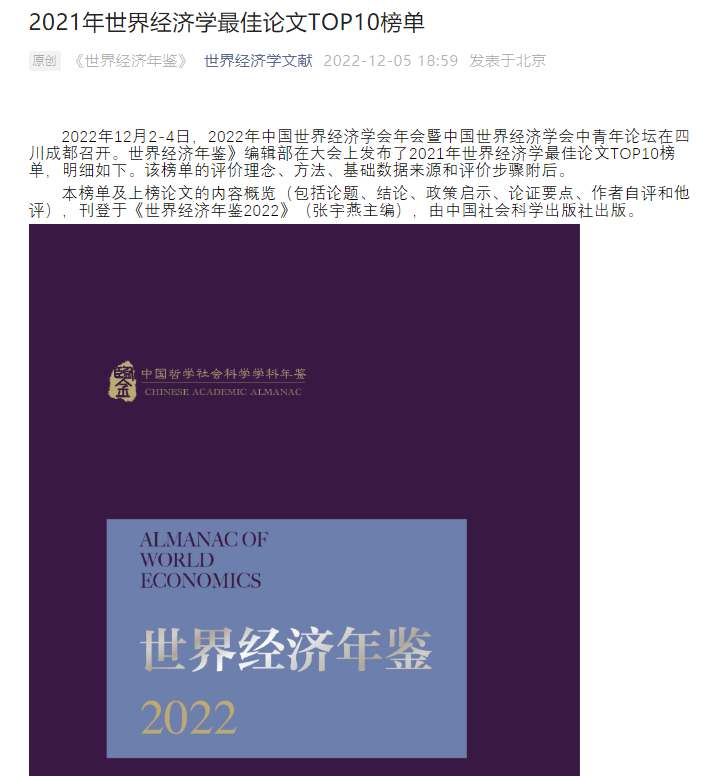 我校国际商务专硕导师论文入选《世界经济年鉴》2021年度优选论文榜单“国际发展经济学”子目TOP10