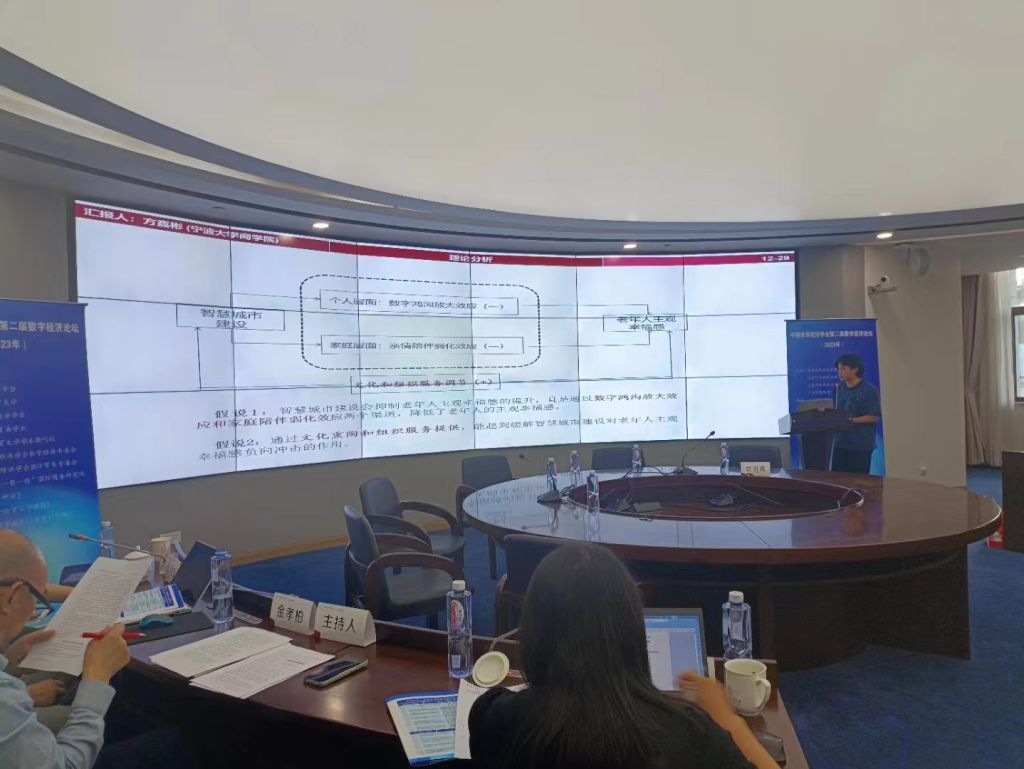 本次论坛征文从5月开始,共收到100余篇来稿。基于扩大学术交流的宗旨,在确保论文质量的前提下,兼顾作者的不同层次、来源和地区以增加多样性和多元化,最终30余位作者与会进行了论文宣讲。我校MIB学位点2022级研究生方嘉彬同学参加了“平行论坛一:中国式现代化的数字经济”,汇报了论文《数字经济的普惠阳光能否温暖老年人群体?》