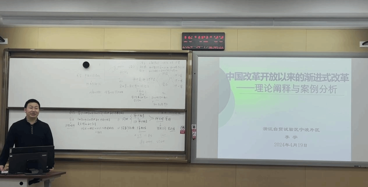 2024419日下午我校MIB国际商务课堂有幸邀请了宁波经济技术开发区管委会自贸区政策法规局副局长李宇为MIB学生讲解中国改革开放以来的渐进式改革从中国改革开放的角度阐述了中国在过去的发展历程中是如何不断提升自身能力加快步伐融入世界贸易大家庭中国发展的奇迹不仅使得中国社会得到富强人民生活得到提升更重要是的中国在短短的几十年间实现了西方国家数百年才能达到的社会发展过程这压缩的几十年对于世界来说是一个中国式奇迹李老师先后介绍了对历史进程改革逻辑相关现实案例以及中国改革开放路径