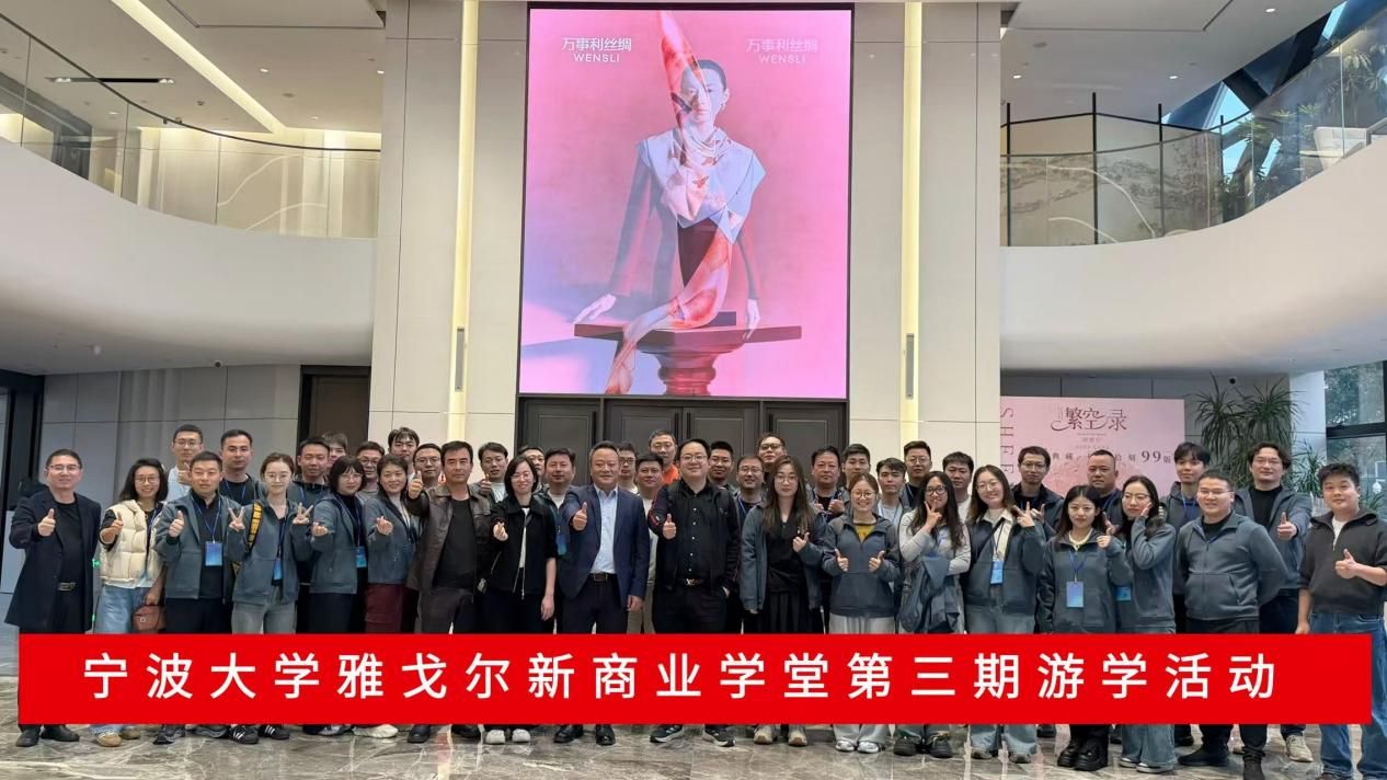 11月15日下午,学员们来到万事利集团,聚焦“传统丝绸产业的转型升级”。在万事利展厅,大家循着企业发展脉络,见证了这家昔日“乡镇企业”在沈爱琴女士的带领下,逐步成长为上市公司的奋斗历程,讲解员也向学员介绍了在近几年的布局,万事利通过 AI 技术优化丝绸印染工艺、提升图案设计效率,同时借助杭州亚运会等国际赛事 IP,将丝绸文创产品推向全球,让传统非遗焕发现代活力。学员们近距离观察丝绸产品的创新呈现,深入了解传统产业与新技术、新场景融合的落地路径。