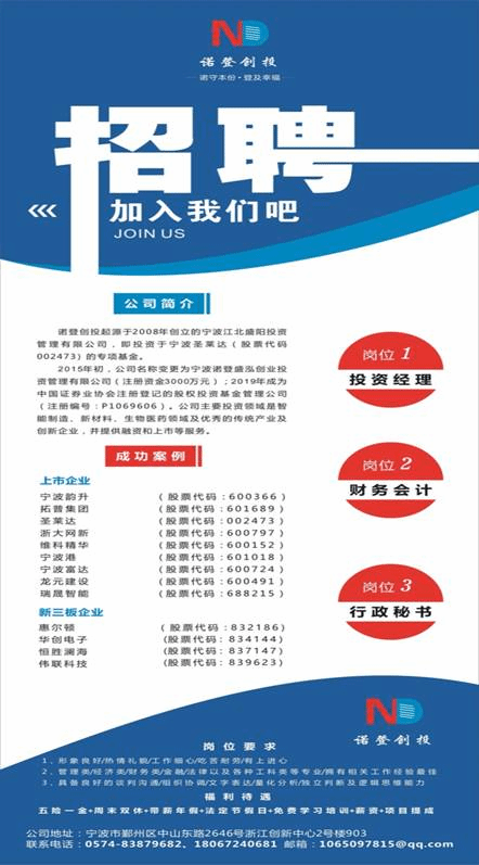 宁波诺登盛泓创业投资管理有限公司招聘简章