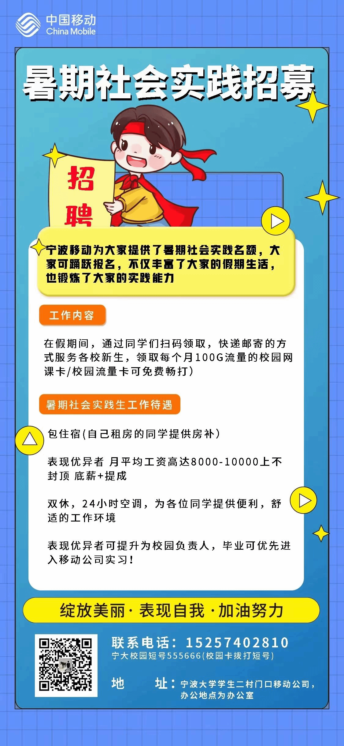 宁波移动为大家提供了暑期社会实践名额,大家可踊跃报名,不仅丰富了大家的假期生活,也锻炼了大家的实践能力