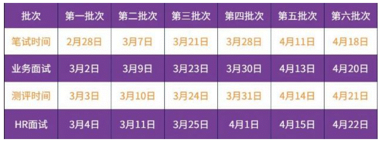 招聘流程:网申-空宣-在线笔试-在线业务面试-在线测评-在线 HR 面试-Offer