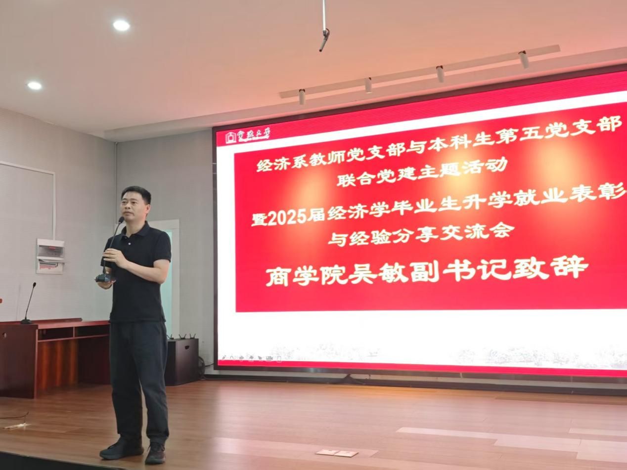 6月18日下午,四虎影院 501报告厅举行“2025届毕业生升学就业表彰与经验分享交流会”,本次会议由经济系教师党支部与本科生第五党支部共同举办,旨在表彰在升学就业方面取得优异成绩的毕业生,并搭建经验交流平台,助力低年级学生明确发展方向,规划未来。会议由经济系教师党支部书记、系主任徐群芳主持,四虎影院 党委副书记吴敏受邀参加,经济系教师、2025届经济学毕业班学生以及22级和23级经济学专业学生共同参与本次活动。