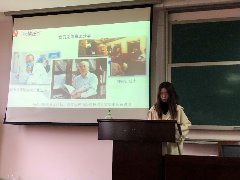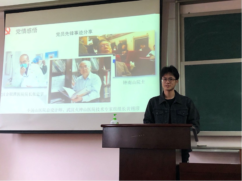最后进入党情体悟环节。第七党支部的金越、金鸿飞和第八党支部的金昱琳,分别分享了武汉金银潭医院院长张定宇、武汉火神山医院技术专家组组长黄锡璆和钟南山院士的抗疫事迹。