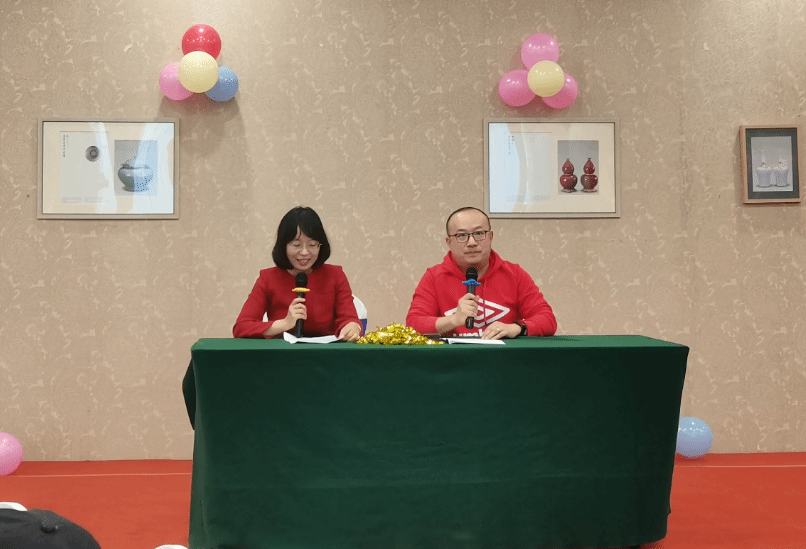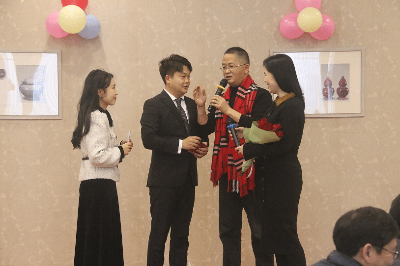 (历年度茶话会主持人与本年度主持人举行交接仪式)