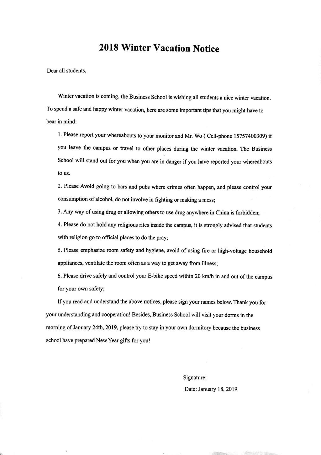 韩雯琛首先就这次安全稳定会议的主要目的及意义发表了讲话。随后,辅导员毛跃祖就留学生在寒假出行、假期日常生活、宿舍安全用电等注意事项进行了解释和说明。最后,四虎影院 留学生办公室辅导员向留学生下发寒假留宿安全告知书,留学生在仔细阅读并明确告知书相关内容后,在告知书上签名。