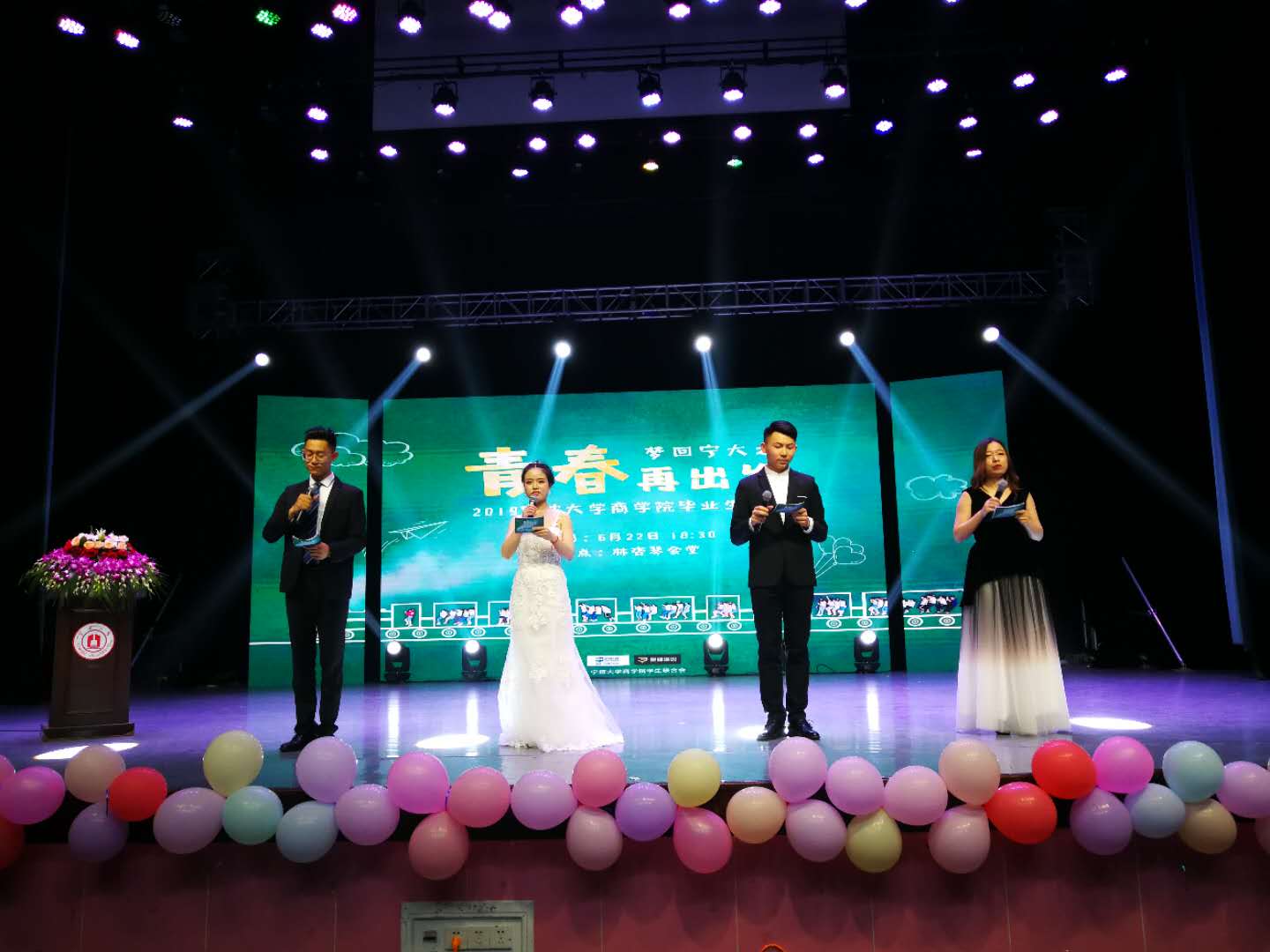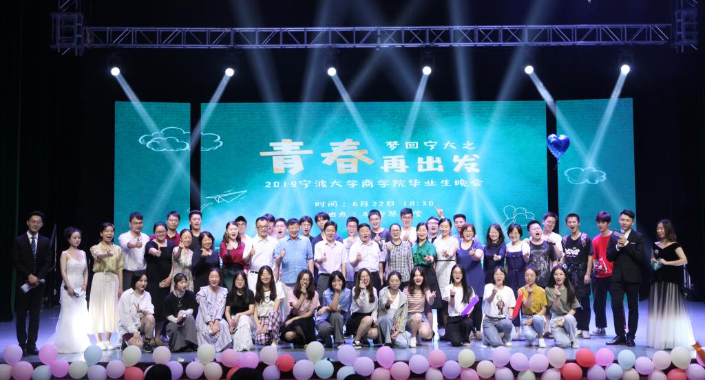 6月22日晚,四虎影院 在林杏琴大会堂举办 “梦回宁大之青春再出发”2019届毕业晚会。院长金祥荣,院党委书记史宏协,副院长盛沛锋、周新苗,院党委副书记韩雯琛,系主任熊伟清,毕业班班主任钱树静、杜琳,还有长期以来关心学生成长的应志芳、张云华、程永毅老师,院办、科研办、教务办、学工办等老师,及600余名毕业学子共同参加了此次晚会。