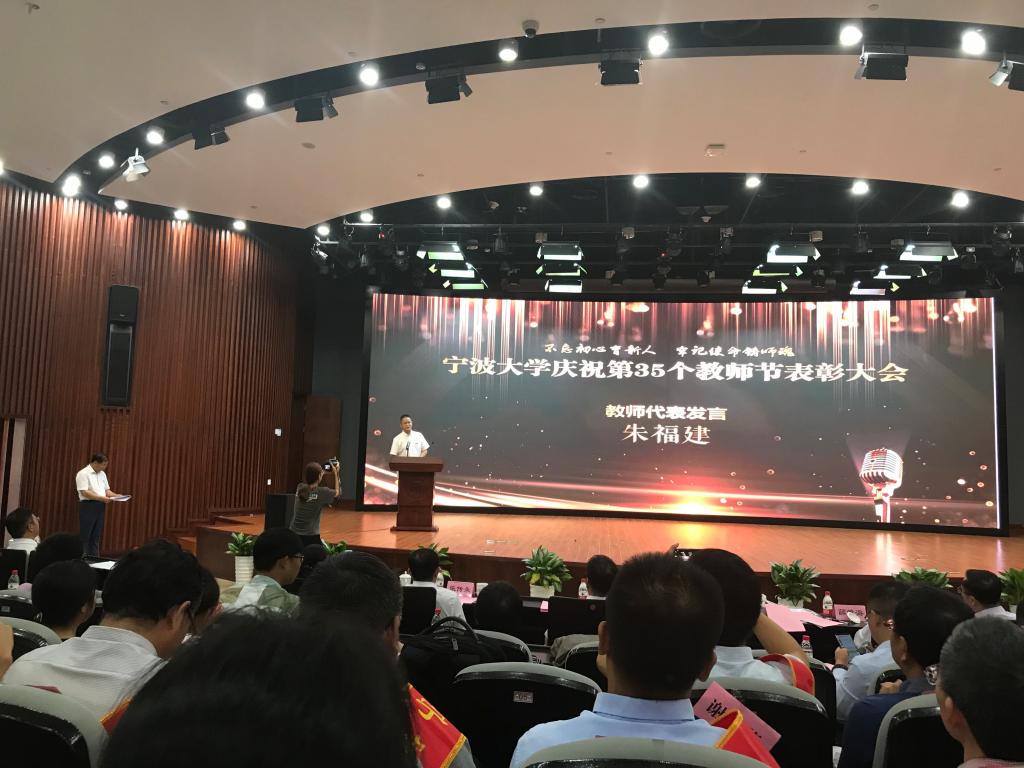 在表彰会上,四虎影院 共有五名教师获得表彰,分别是邱妘获得浙江省高校优秀教师,周新苗获得四虎影院 最受欢迎教授,金安获得宁波市优秀思政课程教师,黄惠琴获得宁波市优秀教师,朱福建获得四虎影院 师德先进个人。表彰会上朱福建老师还代表全体教师做主题为《桃李不言 下自成蹊》的发言。
