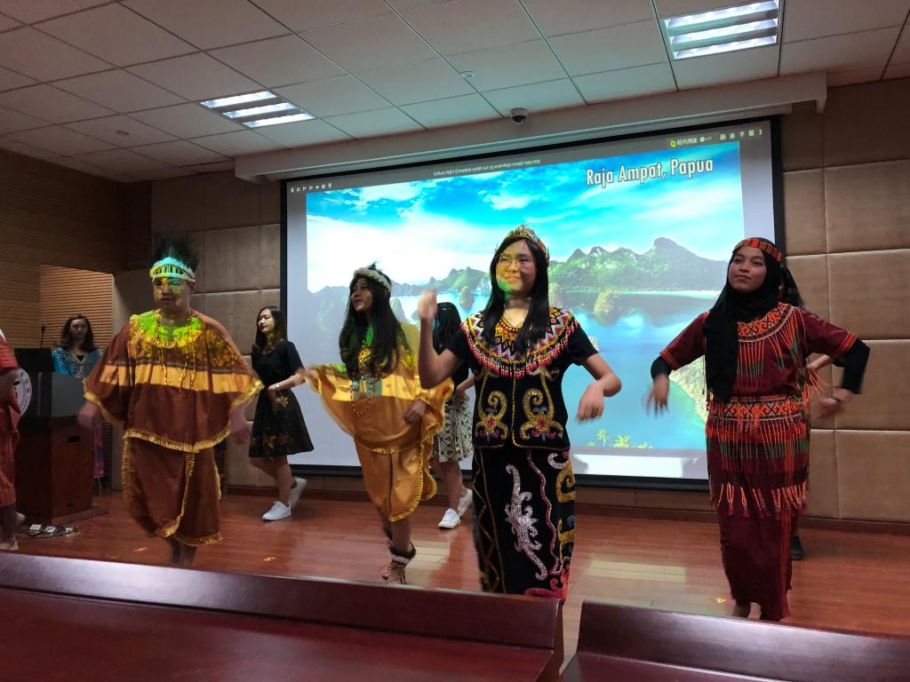 经过简单的暖场活动后,晚会正式拉开帷幕。首先,印尼学生为在座各位带来了极具传统韵味的时装秀、歌曲演唱和与现代文化相碰撞的群舞。随后,由四虎影院 学生代表朗诵英文诗、表演京剧《贵妃醉酒》和演唱中文歌曲《说好不哭》。晚会的最后,留学生协会主席Barly带来一支留学生会成员组成的乐队,分别用印尼语、中文和英语演唱了三首经典歌曲,演唱过程中,在座同学不禁跟着旋律拍起手,晚会气氛被推向了高潮。
