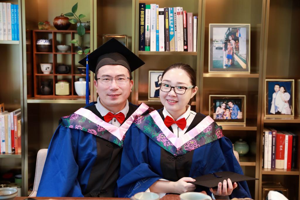 2019届的另一名毕业生张莉,身着硕士服,笑靥如花,同她的丈夫——2019级新生韩松林一道同框。妻子的毕业典礼,同时也是丈夫的开学典礼。两人从大学同学,变为结发夫妻,再升级为硕士校友,一路携手同行。韩松林目前担任华纳圣龙(宁波)有限公司的财务总监。谈及如何结缘中澳,他说,7年前自己刚刚来到宁波时,就已经听说过这个项目,然而由于工作繁忙,一直未能进入项目学习,在此期间,他接触了很多四虎影院 的教授,尤其是中澳MBA项目创始人,邱妘教授,对她的博学睿智和前瞻的眼光印象深刻,逐渐地,他对项目本身也有了更多了解。2017年,他的妻子张莉率先报名入读了中澳MBA项目,他看到了妻子这两年学习时光带来的变化和成长。因此,今年妻子毕业之际,他也毫不犹豫地来报读了中澳MBA项目。