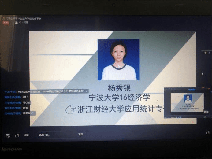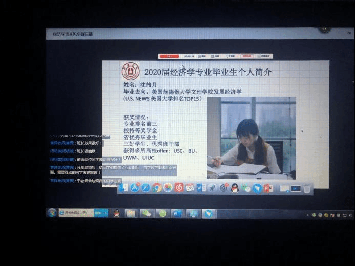 经济学作为经济类学科的基础专业,读研一直是学生的重要选择。在学院的支持和关怀下,经济系逐步建立起了考研留学指导制度,并于2019年底专门成立了经济学会学生社团,通过不定期活动分享考研信息和经验,激发学生考研和留学的兴趣。在学院和经济系老师的大力支持下以及班主任闭明雄老师和经济学会指导老师的共同努力下,今年的升学工作取得了喜人的成绩。2020届经济学专业毕业生36名,其中国内读研6人,出国留学5人,升学率达到31%,创历史新高。在毕业生即将离校之际,经济学会于6月26日下午组织了一场升学经验交流会,分别由2020届本专业毕业生中成功考研和出国留学的优秀学生向2017级和2018级有志升学的学弟学妹们分享奋斗的经验。本次交流会由经济学会负责人、2017级经济学专业班主任于冰主持,经济系教学系主任黄晖和2016级班主任闭明雄全力协调。由于正值毕业生离校之际,又是端午假期,本次交流会采取灵活的钉钉直播的方式开展。为了使同学们能熟练运用钉钉直播,于冰老师花费了大量的时间给学生一对一地指导,从而确保了交流会顺利地进行。