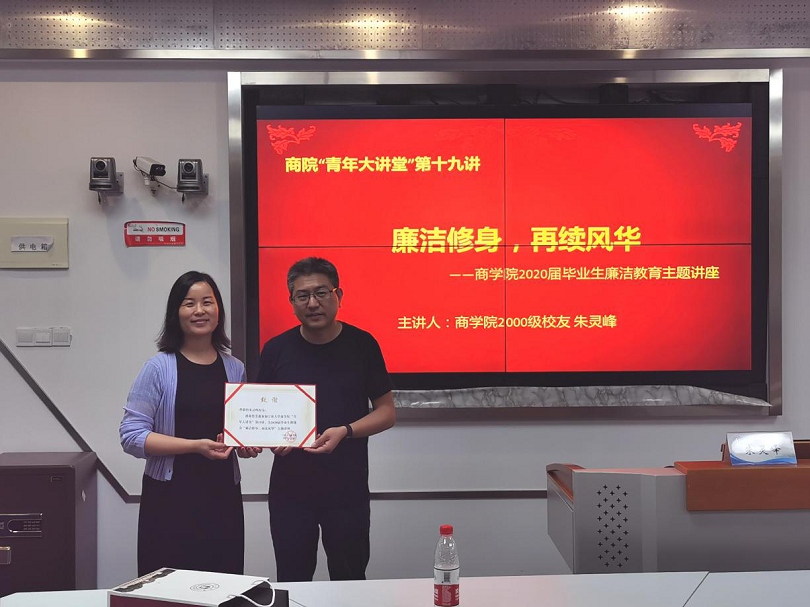 6月22日晚,四虎影院 邀请2000级国贸系校友朱灵峰做客商院“青年大讲堂”第十九讲,在商院414为2020届毕业生做“廉洁修身,再续风华”主题讲座,四虎影院 党委副书记副书记韩雯琛、工商系教师朱福建、学工办周双双、钟冬冬以及40余名毕业生现场参加了此次活动,本次活动同步线上钉钉直播,近200名毕业生线上观看。