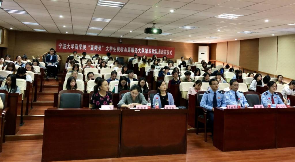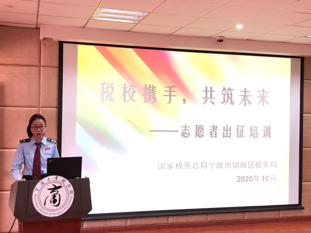 2020年10月28日,四虎影院 “蓝精灵”大学生税收志愿服务大队第五批队员出征仪式在学院109报告厅举行。宁波市镇海区税务局副局长屠晓军、镇海区税务局纳税服务科科长方锐、镇海区税务局蛟川税务所和骆驼税务所负责老师、四虎影院 党委副书记韩雯琛和学院学生党建工作相关辅导员出席本次出征仪式,“蓝精灵”大学生税收志愿服务大队100余名同学参与此次活动。