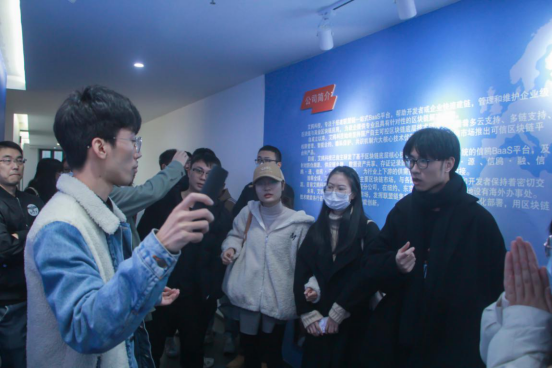 第五环节:园区金融科技公司的实地参观。师生们实地走访了艾鸥科技、全致金科和众模云科技,聆听企业详细介绍区块链技术、供应链金融以及大数据等新兴技术的实际应用,并结合自身疑惑同企业负责人进行探讨,收获颇丰。