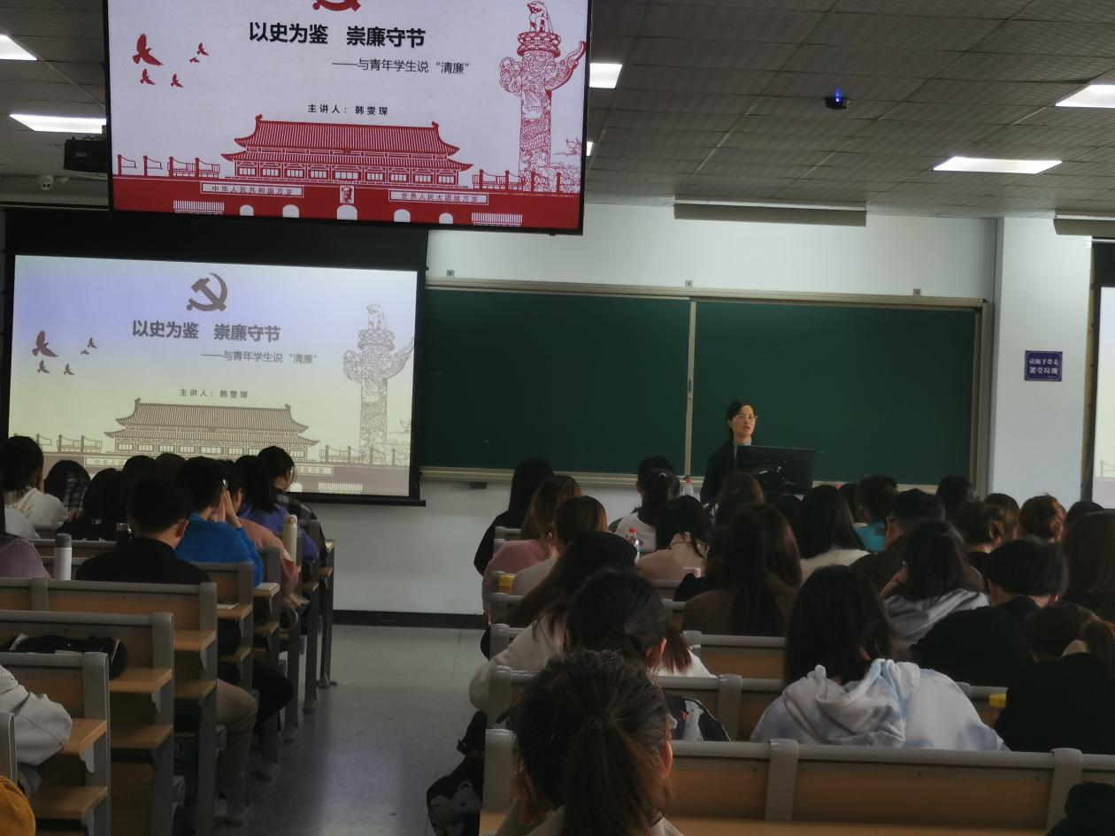 4月21日下午,四虎影院 成功举办了“以史为鉴 崇廉守洁——与青年学生说“清廉””第45期廉洁教育课。四虎影院 126名发展对象参与,院党委副书记、纪委书记韩雯琛担任主讲人。