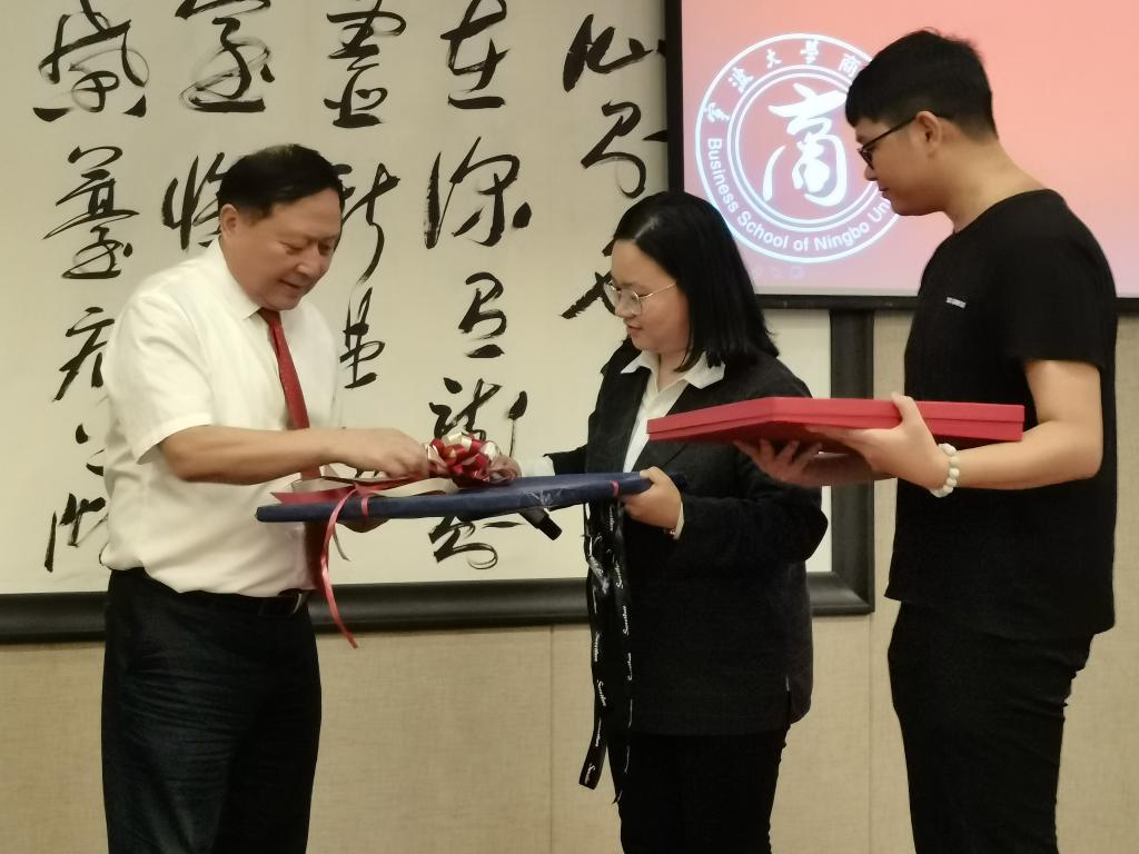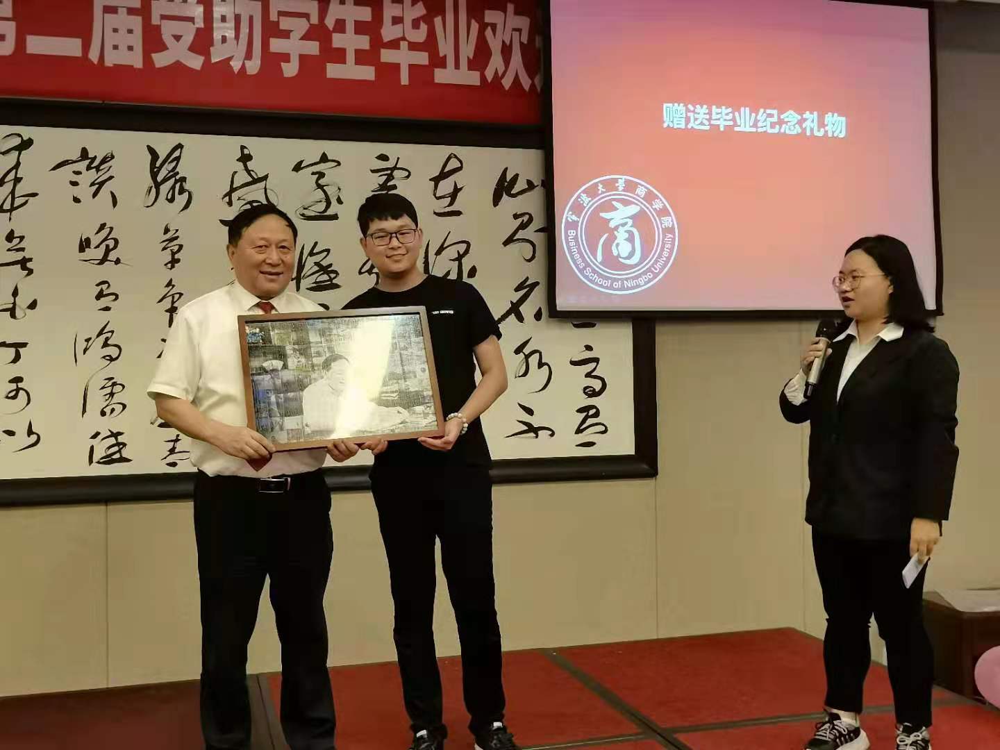 合照结束后,与会人员步行到宁大宾馆白鹭厅开展送别仪式。首先,由李莹春代表“宏达奖助学金”全体毕业生讲述他们与陆董事长的故事,她深情回忆了同学们与陆汉幸相识、相处的点点滴滴。随后,陆汉幸向2020-2021学年“宏达毕业生奖学金”获奖学生颁发证书,并合影留念。