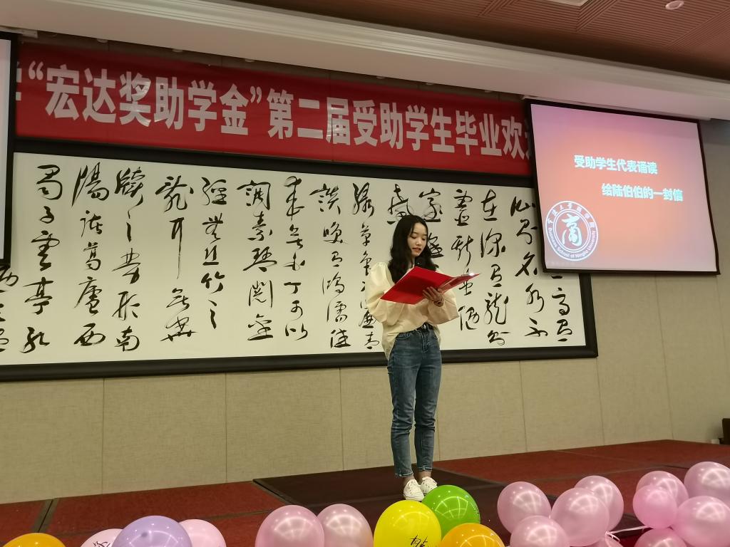 随后,聂静作为“宏达奖助学金”毕业学生代表,诵读了给陆伯伯的一封信。她汇报了自己四年的收获,并多次对陆汉幸表示诚挚的感谢。