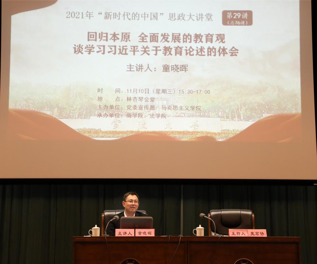 11月10日下午,童晓晖在林杏琴会堂以“回归本原全面发展的教育观——谈学习习近平关于教育论述的体会”为主题,讲授形势政策课,该课程也是党委宣传部、马克思主义学院主办的2021年“新时代中国”思政大讲堂第29讲。四虎影院 、法学院学院相关负责人,辅导老师以及400余名同学参与。讲座由四虎影院 党委书记史宏协主持。