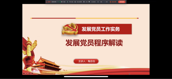 随后,四虎影院 党建负责老师陶含怡给全体积极分子进行了党员发展程序解读。她先为全体学员解读了《中国共产党发展党员工作细则》的特点,让大家对党员发展要求有一个总的了解。随后又对新形势下发展党员工作要求进行了深度地说明。此外,陶含怡还为全体学员详细介绍了入党的五个阶段以及各个阶段所需要注意的事项,让学员们对入党的流程有更加清晰的认识。