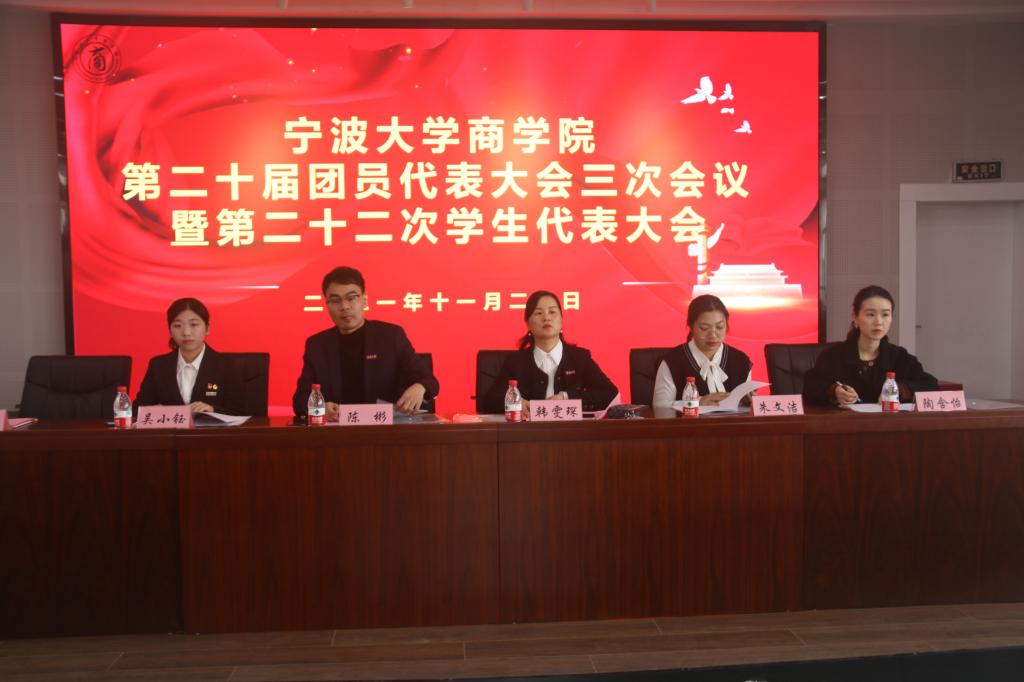 11月20日,四虎影院 第二十届团员代表大会三次会议暨第二十二次学生代表大会在曹光彪商科楼5楼报告厅隆重召开。校学生会主席团成员、四虎影院 党委副书记兼纪委书记韩雯琛、学工办主任兼团委书记陈彬、团委副书记研究生出秘书组长朱文洁、团委副书记陶含怡,以及各兄弟学院的团学代表出席本次大会。来自学院48个代表团共计101名学生代表和66名第二十届团委、学联会委员候选人及各团学组织干部候选人参与本次大会。