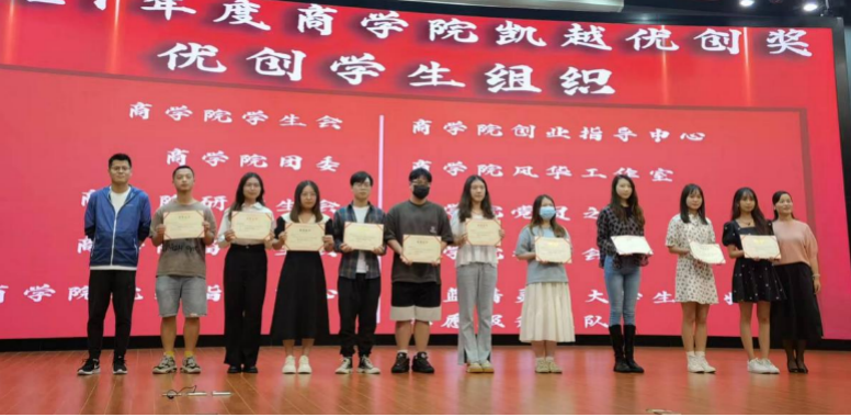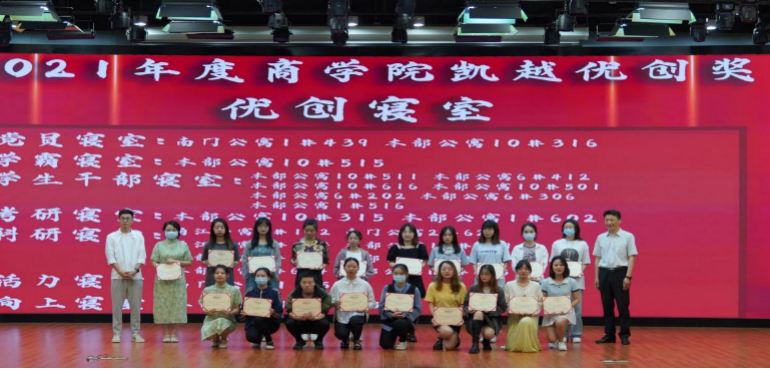凯越集团罗旭平,朱吉、戴陟遥上台给荣获2021年度四虎影院 凯越优创奖——优创寝室、优创学生组织、优创党支部的学生代表颁奖并合影留念。据悉,该奖项由四虎影院 校友企业凯越国际贸易有限公司设立,三年共出资30万元,鼓励支持学院优秀学生团队和促进学院学生素质发展。