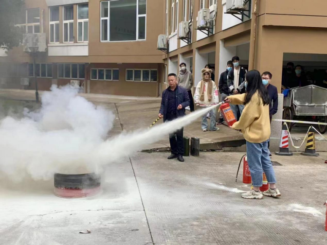 为了使同学们更好理解灭火器的使用方法,现场准备了柴油桶、柴油等道具。郑永辉在演练道具柴油桶中倒入水和柴油,随着火焰的燃烧,郑永辉使用灭火器亲自为大家进行了示范,并详细向现场的同学们讲解了灭火器的构造、使用方法和操作步骤。在随后的模拟演习环节中,在场的同学们积极参与到实践中,亲自上手使用灭火器,体验灭火过程。本次演练的同学们都表示受益匪浅,并表示到将把自己所学的消防知识传授给班级同学。