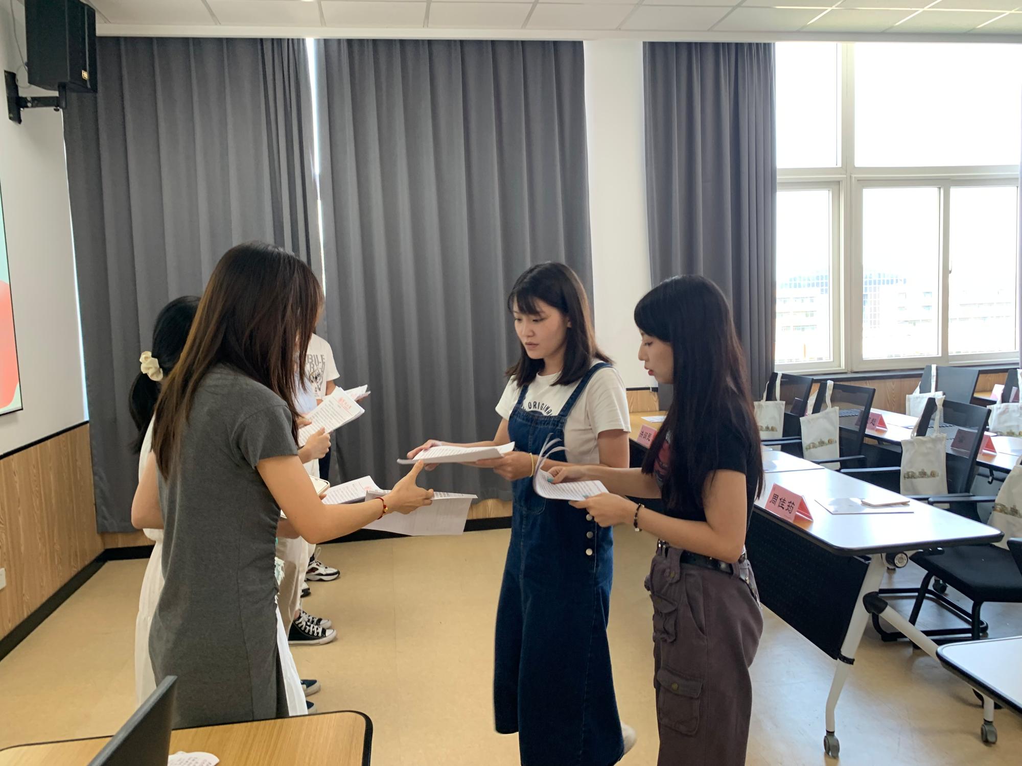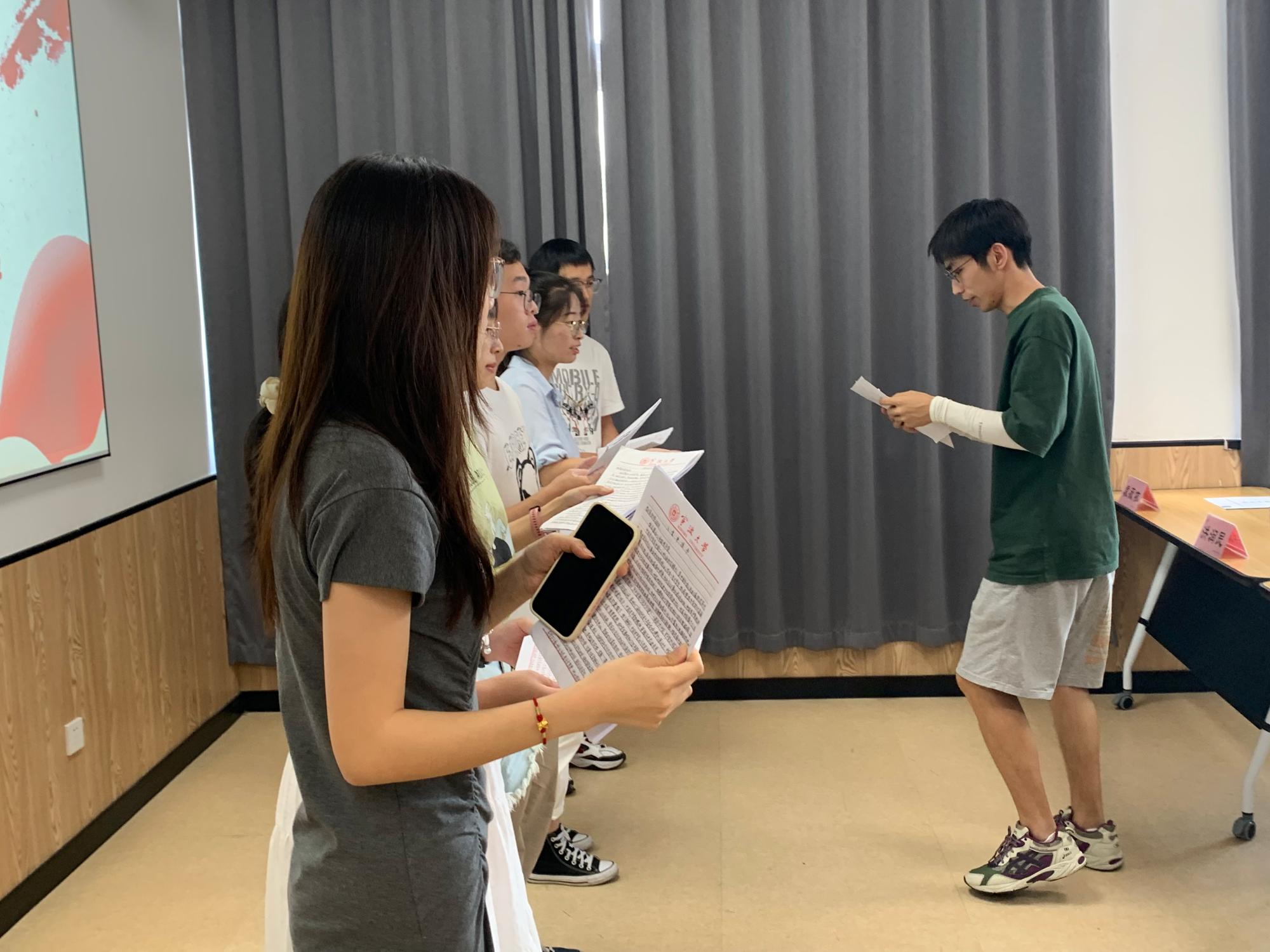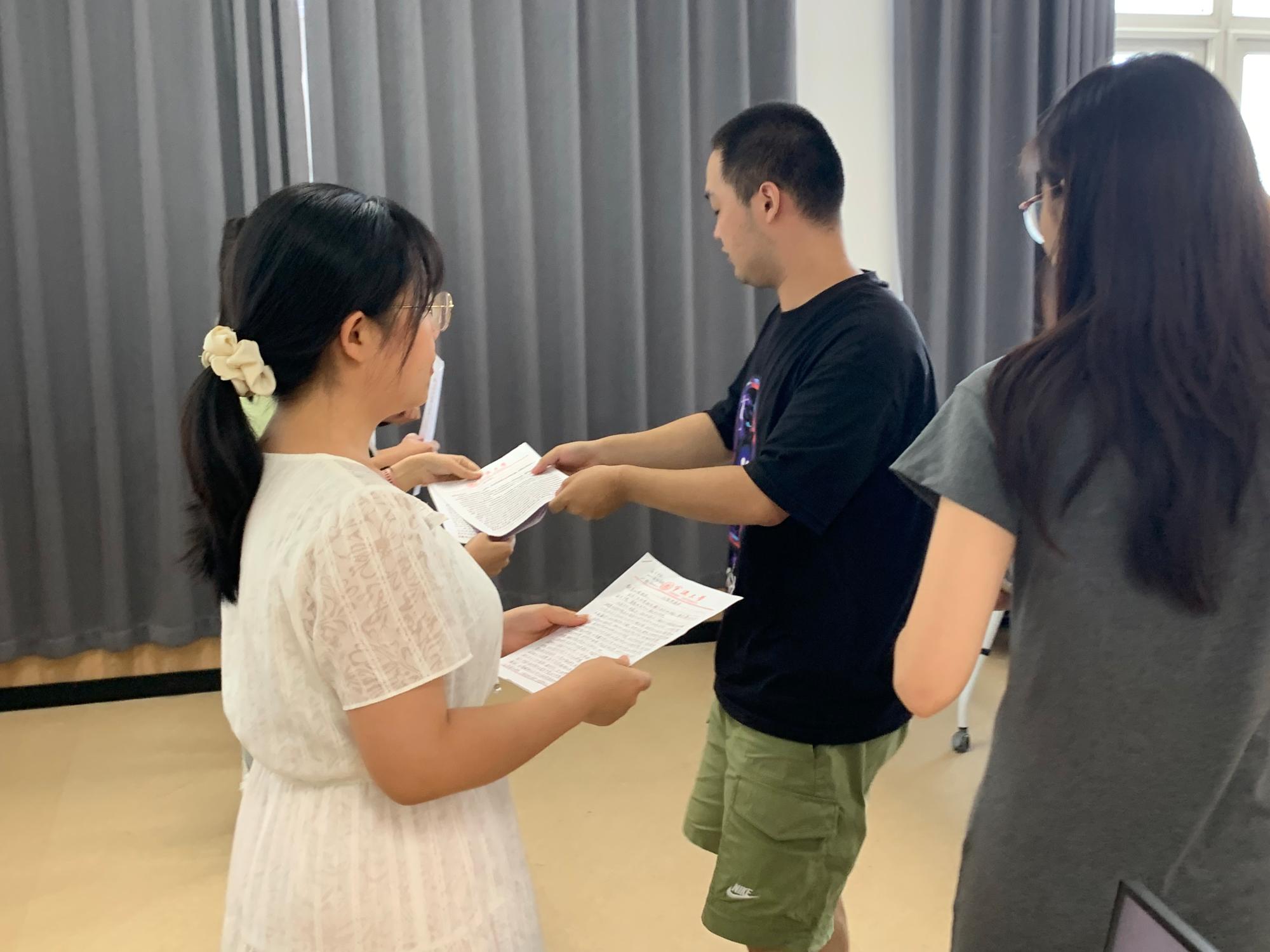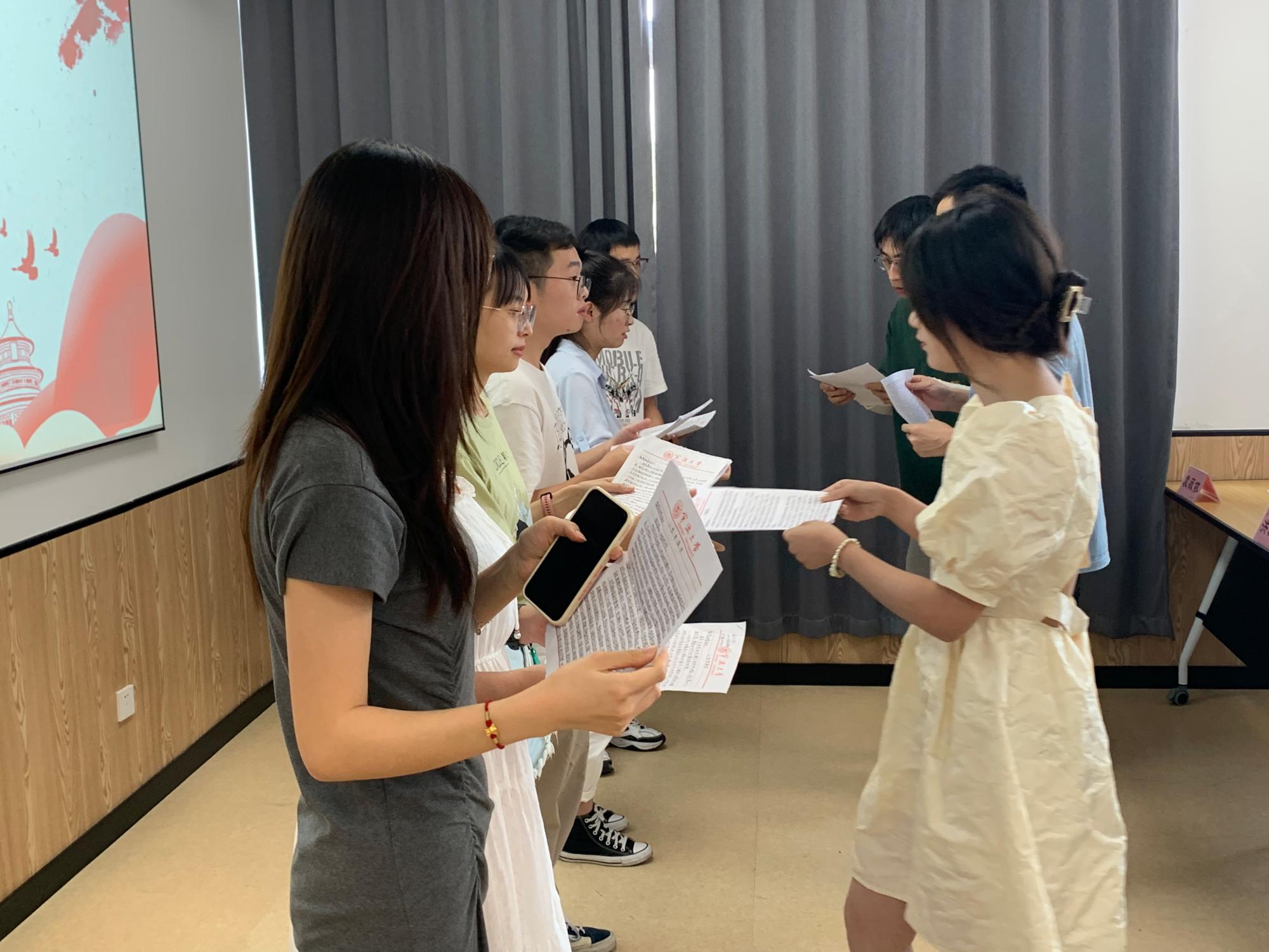 在庄严的国际歌中,2022级研究生新生依次上前,向支部书记和辅导员陶含怡递交入党申请书。