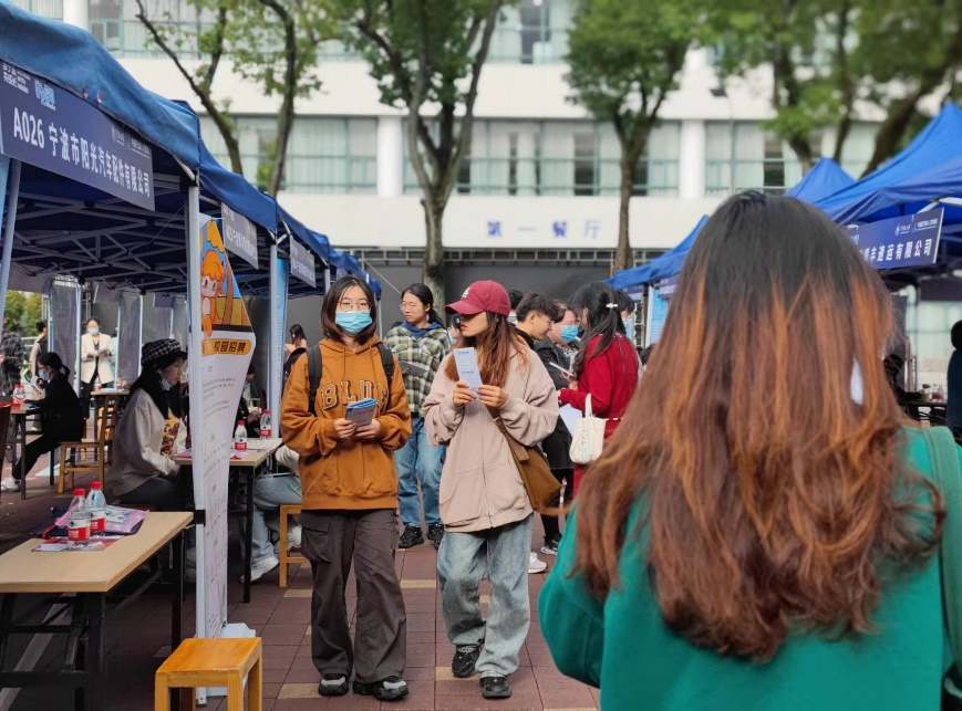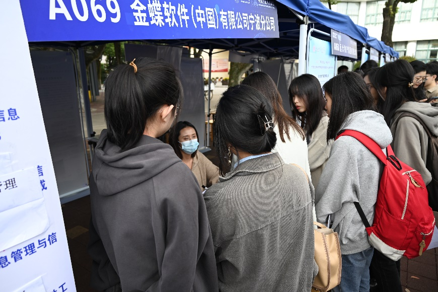 本次招聘会有宁波银行、金田铜业、赛尔、美博等100家企业参加,面向各种专业人才提供管培生、会计、人力、行政等1000余个岗位。现场招聘气氛热烈,应届毕业生们手持简历和自荐书,在人流中穿梭,积极与招聘单位交流沟通,也有不少低年级的学生来到招聘会现场与hr交流关于企业和岗位的要求,为未来就业提前做好准备。