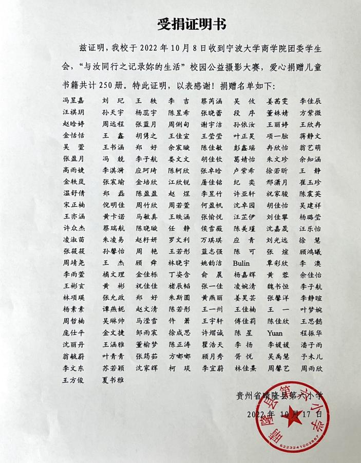 在活动结束当天,得票数前一百名的同学荣获优秀奖,票数满30票的选手都以自身名义向贵州省晴隆县第六小学捐赠图书。