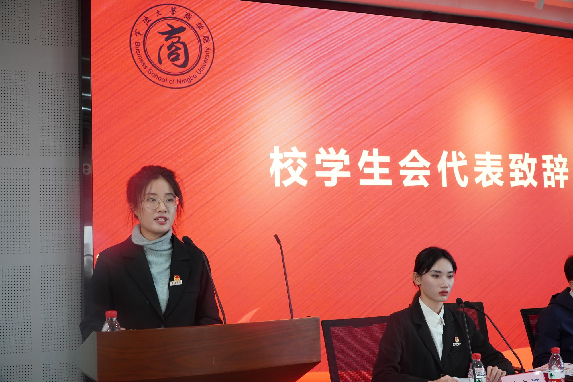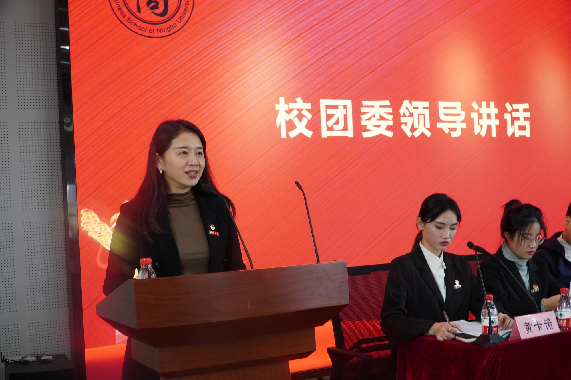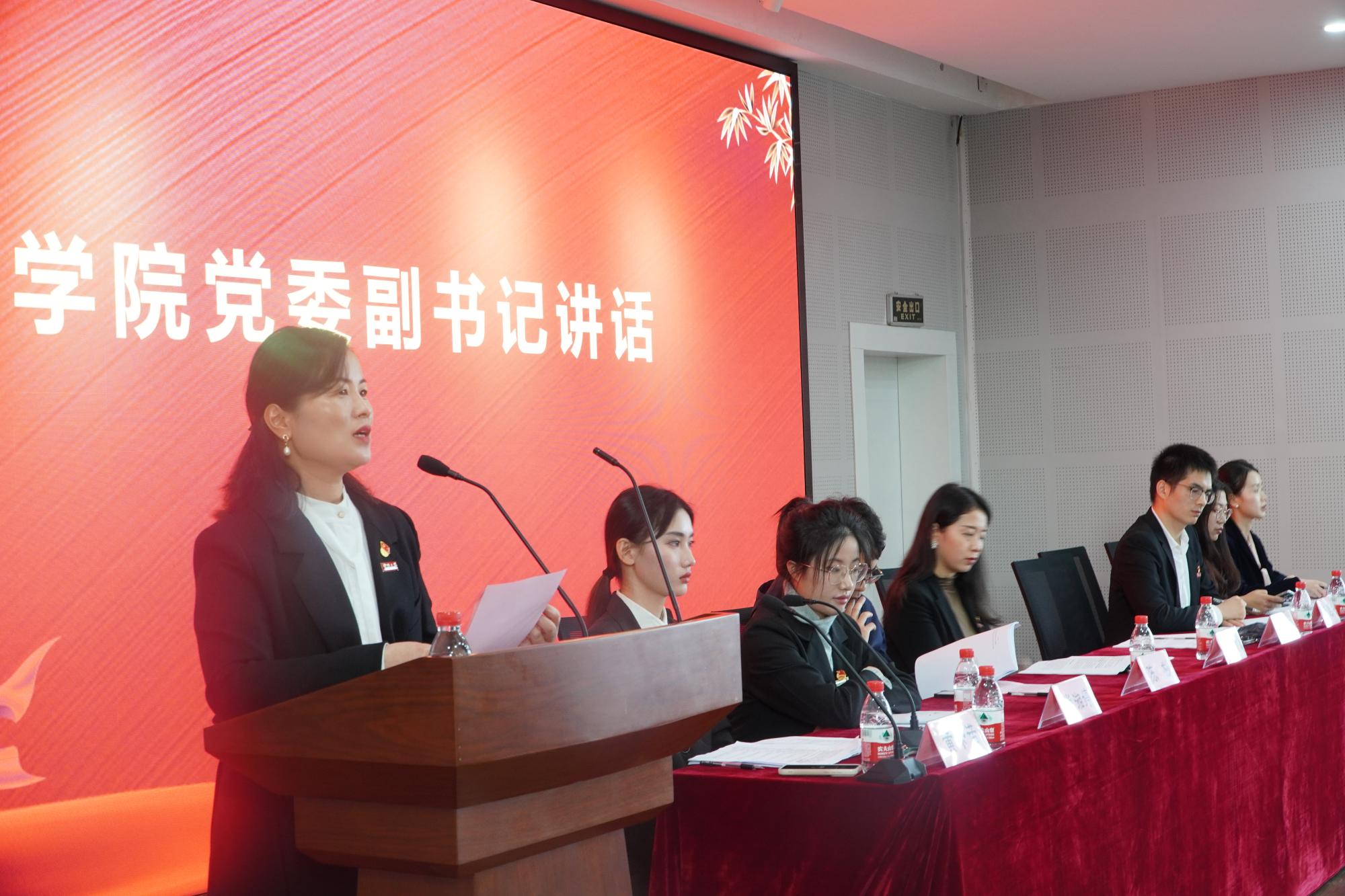 随后,学院党委副书记韩雯琛致辞,她首先肯定了上一届团委与学生会发挥着积极作用,为学院的稳定和发展做出了重要的贡献,接着回顾了过去一年商院学子风采,充分肯定了商院学生在各个方面取得了可喜的成绩。并表达了校方与学生相互信任的观点,希望共同创建优良学风,营造积极的学习氛围,齐心协力共同进步。最后,韩雯琛对新一届团委与学生会委员提出了几点期盼,希望各位学生干部能坚定理想信念,开展一系列更加有质量的活动,最重要的是要不忘初心,牢记使命,共同为学院综合实力的提升而努力。