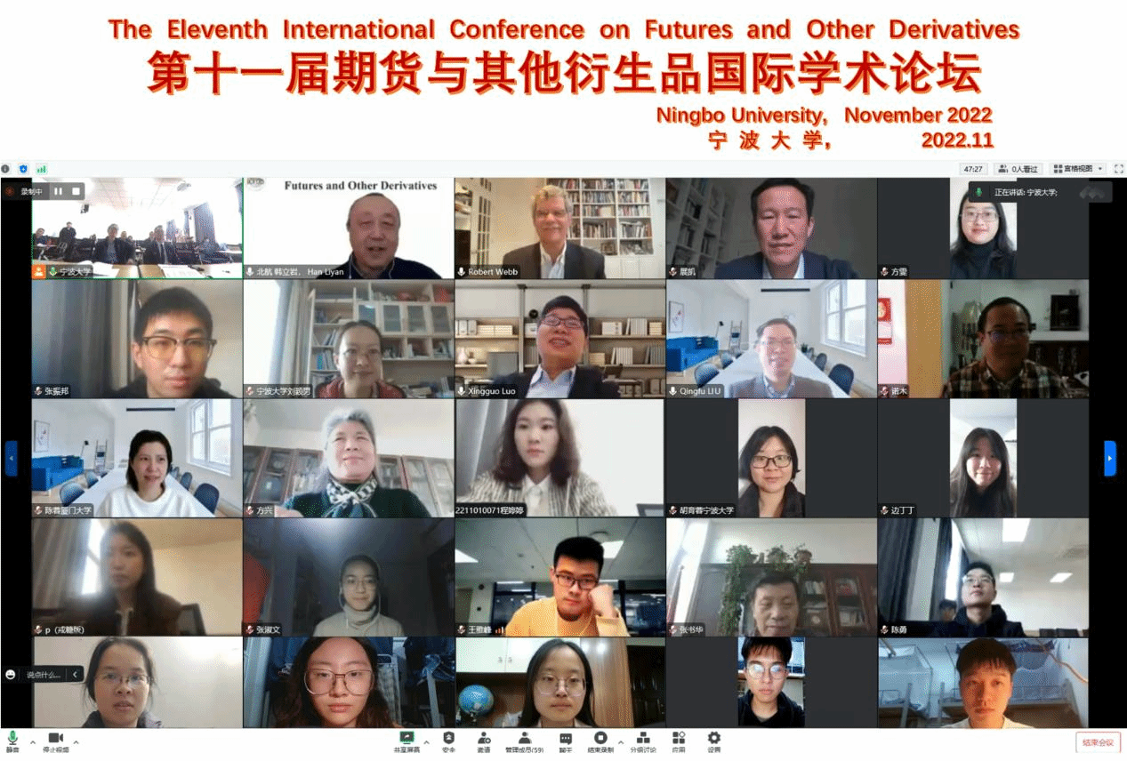 2022年11月5日至6日,第十一届期货与其他衍生品国际学术论坛在四虎影院 以线上与现场的混合模式顺利举行。 会议由四虎影院 主办,四虎影院 、四虎影院 可持续金融研究中心和(浙江省新型智库)四虎影院 中东欧经贸合作研究院共同承办。四虎影院 盛沛锋副院长出席开幕式并致欢迎辞,美国弗吉尼亚大学Robert Webb教授及厦门大学陈蓉教授作精彩的大会主旨演讲。四虎影院 可持续金融国际研究中心主任章勇敏教授与北京航空航天大学的韩立岩教授担任本次论坛的共同主席,并主持了欢迎仪式及大会主论坛。