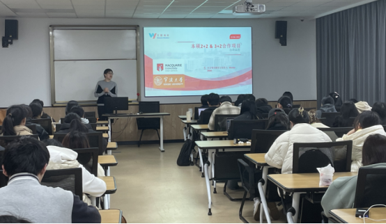 随后,MONICA女士和张钰慧老师还为四虎影院 全英文专业学生做了关于3+2本硕项目的介绍。