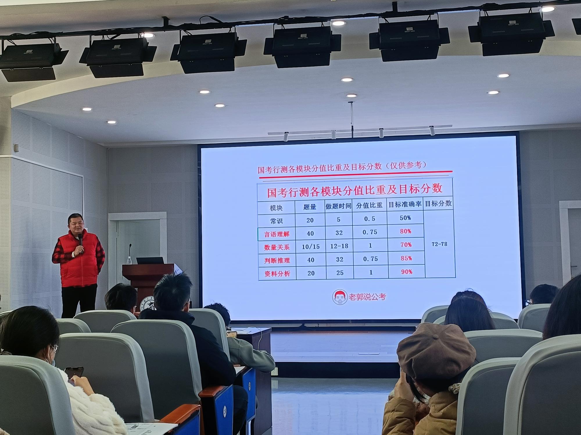 然后,郭老师介绍了公职人员部分地区的薪资待遇,并罗列了十多次考试时间和类型。他重点介绍了宁波高层次人才引进和浙江省选调生两个考试,并拿经典题型做了示范性讲解。整个讲座过程中,郭老师与同学们进行了积极的互动,通过向同学们发布面试题、公考真题让同学们对公考有一定的了解。