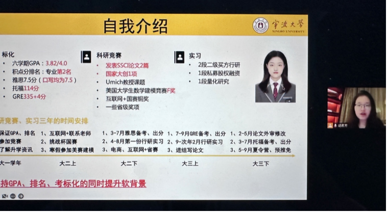 胡君芳对大一到大三整个科研竞赛、实习的时间做了严谨细致的安排。对于保研还是留学这两条路径,她曾陷入挣扎,但最后权衡利弊,选择了中财;对于实习路径,胡君芳认为“实习的目的是了解真实企业、确定就业方向”,并给出了第一份实习的建议;此外,对于要不要考研这一大多数同学都将遇到的问题,胡君芳同学也为在座的同学们带来了中肯、得道的见解,“保研、留学压力的核心在于能不能去理想的学校,而考研的压力核心在于能不能考上,考不上是否二战。”演讲的最后,胡君芳勉励同学们“乘风破浪,未来可期”,并送上了诚挚祝愿。
