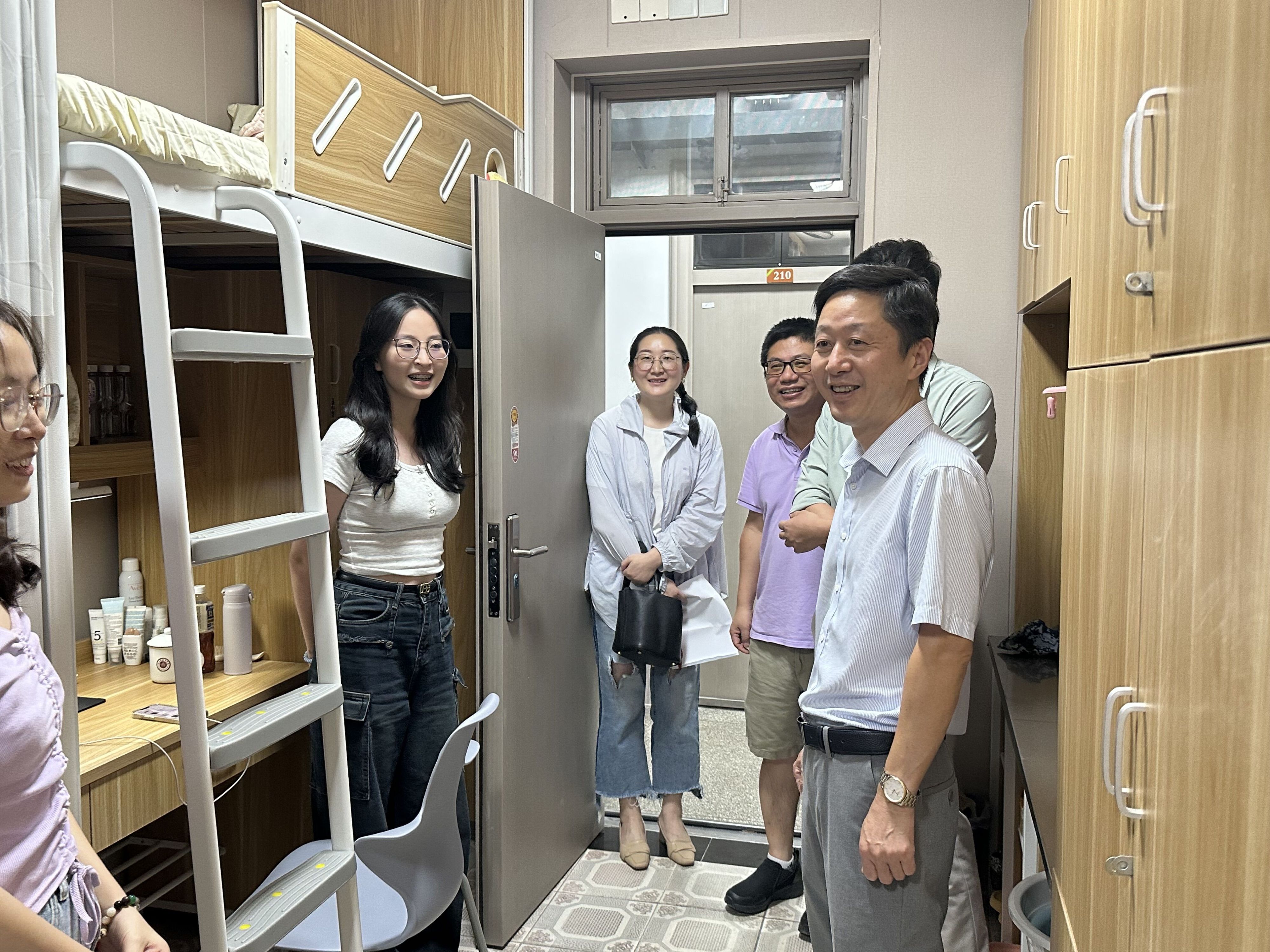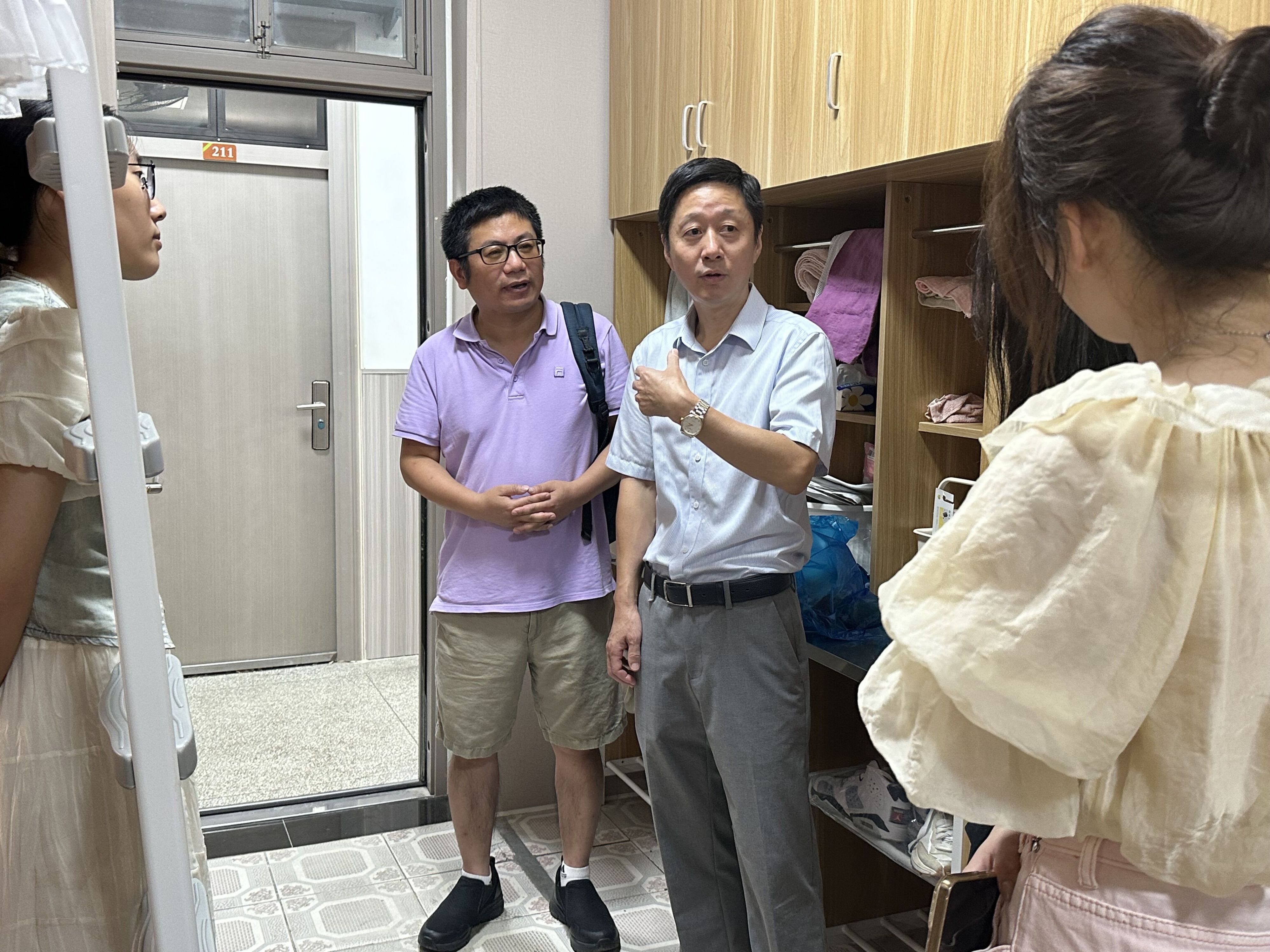 为深入了解新生开学报到情况及生活状态,加强学生寝室安全管理工作,9月1日下午,四虎影院 党委书记史宏协、23级工商管理(中加学分互认)班班主任徐挺老师与学工办辅导员老师深入23级新生寝室,与同学们进行亲切交流。