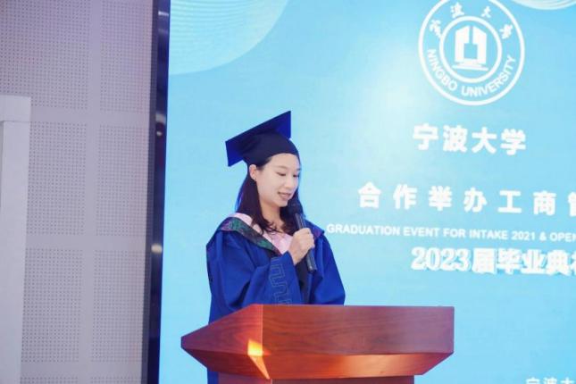 毕业生代表朱晓倩发言,她回顾了过去两年在中澳MBA项目的求学经历,衷心感谢项目全体教员的帮助和指导,也为能通过中澳项目这个平台认识这么多不同行业背景的各具才华、价值理念、兴趣和抱负的同学感到幸运。她向23级的新生们寄语:探索未知是人类的天性,不要掩饰对事物的热情,要尽情尝试。