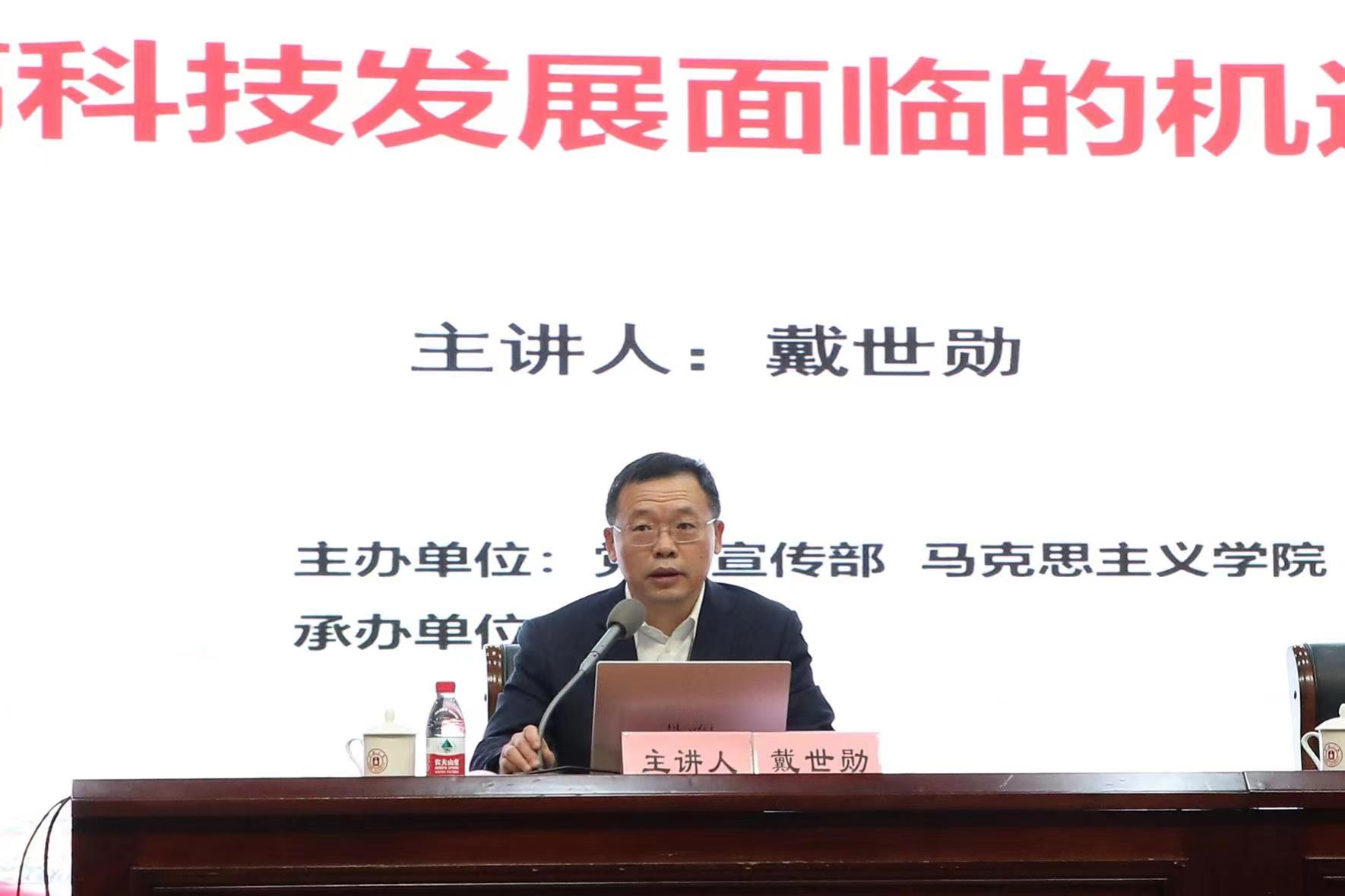 11月29日下午,校党委委员、组织部部长戴世勋在真诚图书馆报告厅为四虎影院 460余名学生讲授“形势与政策”课,四虎影院 党委书记史宏协主持。