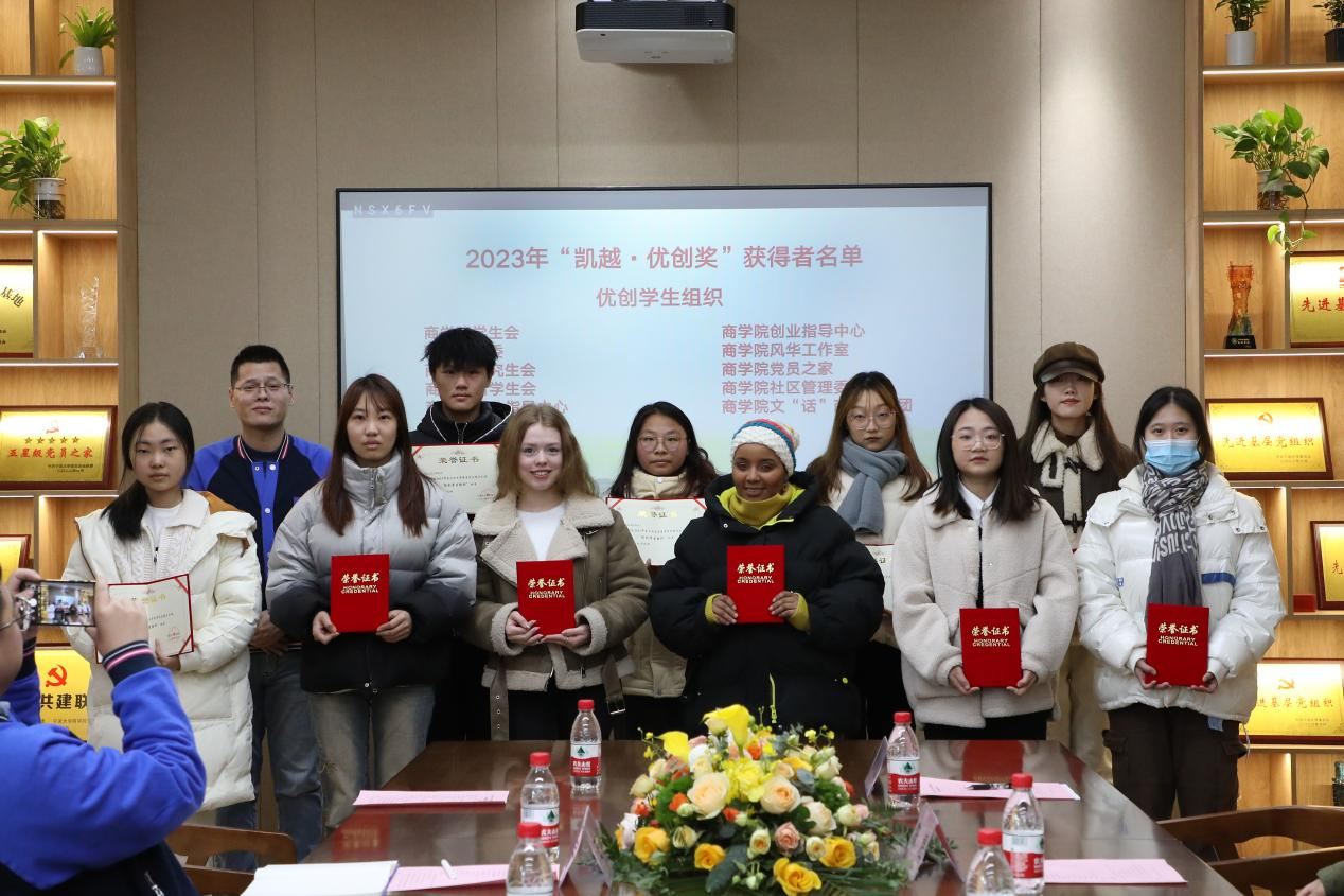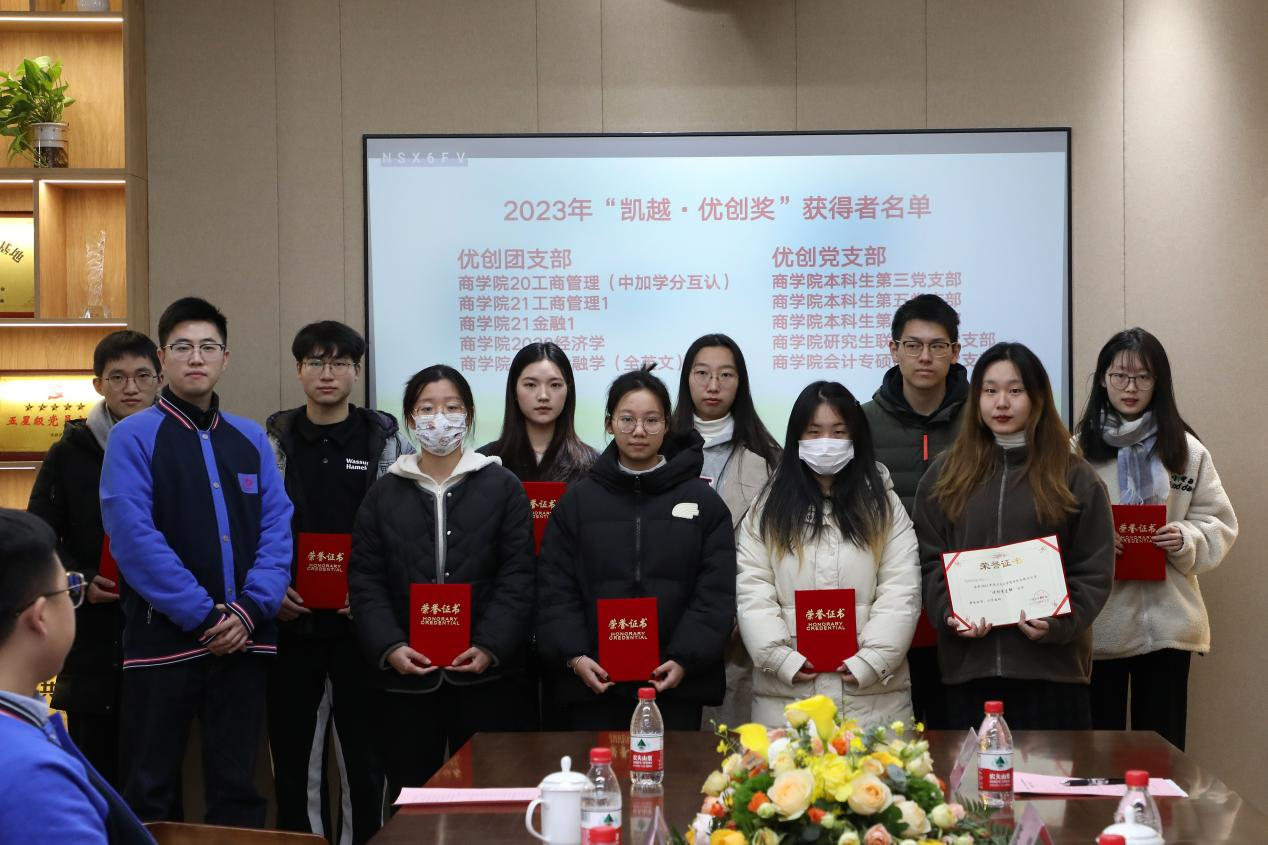 12月21日下午,四虎影院 2023年“凯越·优创奖”颁奖仪式暨“凯越奖学金”签约仪式在四虎影院 党员之家举行,凯越集团总裁助理朱吉,凯越集团人事部副经理王忠宇,凯越集团人事部经理助理戴陟遥,四虎影院 党委书记史宏协,党委副书记韩雯琛,四虎影院 校友办陈煜,四虎影院 学工办主任陈彬,四虎影院 辅导员孙健维、麦尔阿巴以及获奖学生团队代表等40余名师生出席本次活动。