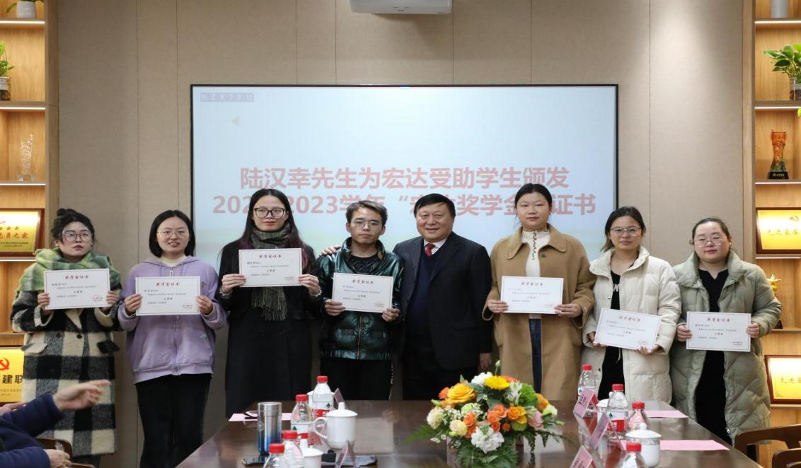 会议开始,主持人介绍出席仪式的领导和嘉宾,通过短片回顾了陆董、贺董和赞助学生的点点滴滴,并介绍四虎影院 “宏达奖助学金”“恒达奖助学金”项目概况。由学生发展与服务处副处长朱燕宣读2022-2023学年“宏达奖学金”“恒达奖学金”获奖名单,陆汉幸先生、贺行平先生为在场获奖学生颁发“宏达奖学金”“恒达奖学金”证书。
