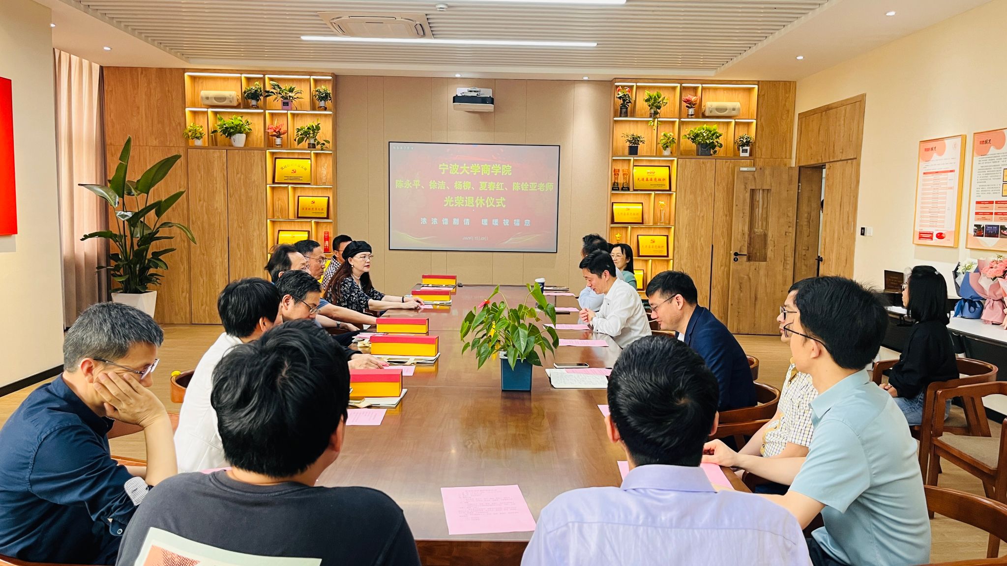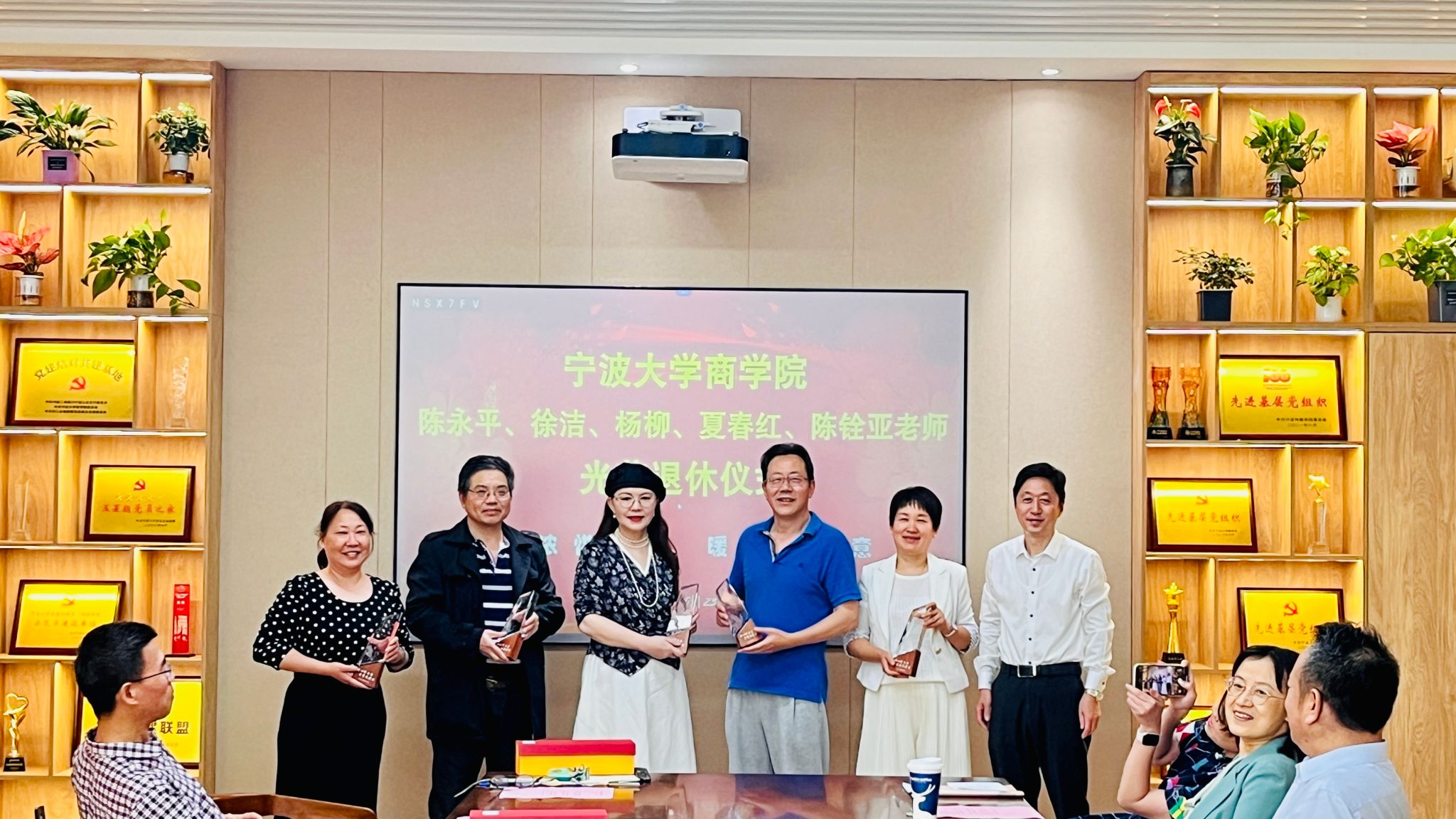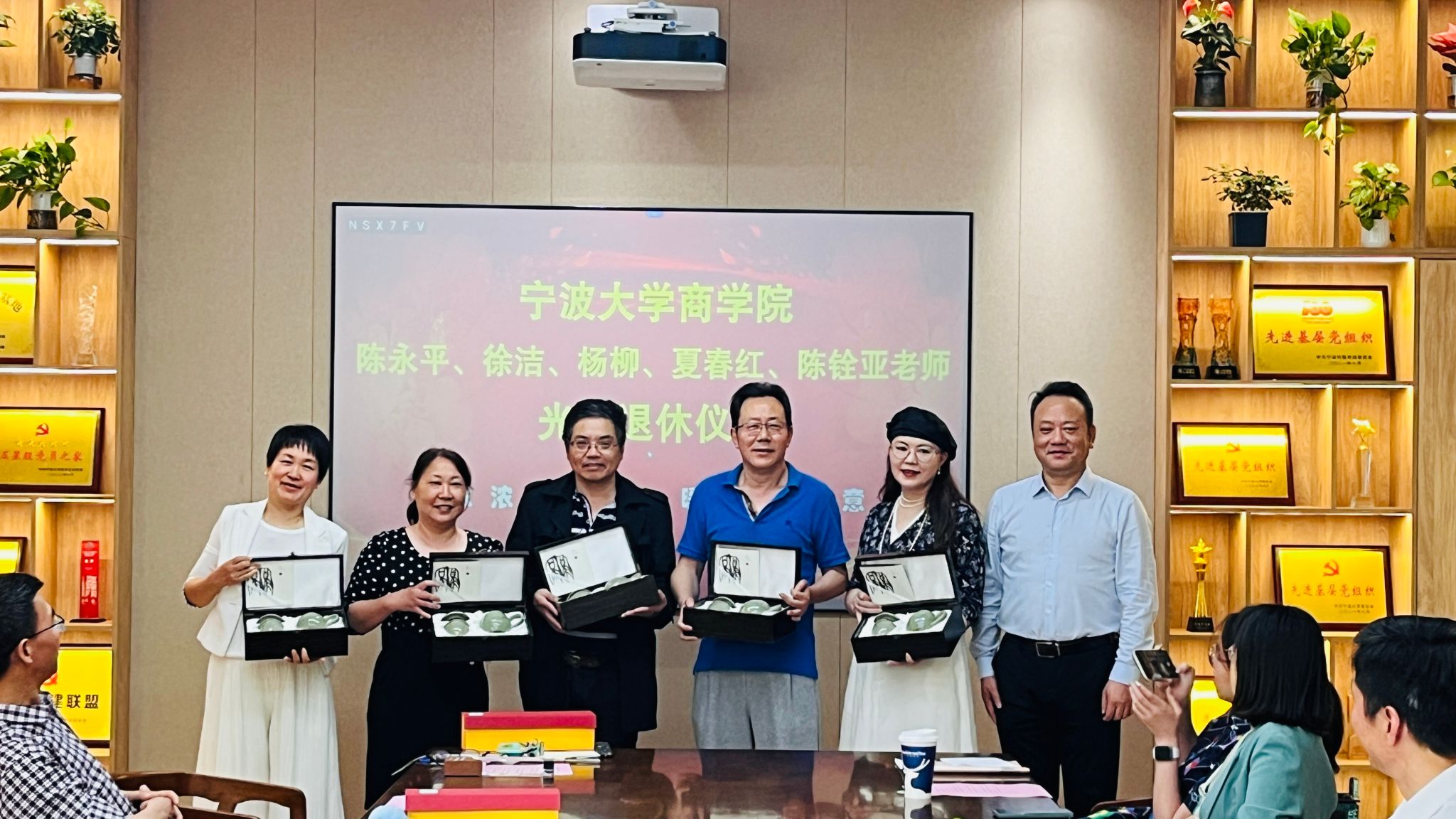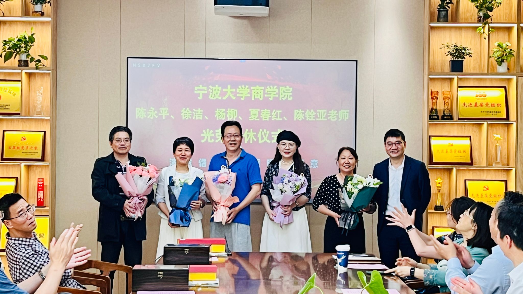 5月23日下午,四虎影院 在曹光彪楼党员之家为2024年上半年退休的陈永平、徐洁、杨柳、夏春红、陈铨亚五位老师举行荣休仪式。仪式由党委书记史宏协主持,副书记韩雯琛、副院长陈涛、副院长彭新敏出席仪式,会计系、金融系、行政教师代表共同见证了这一温馨的时刻。