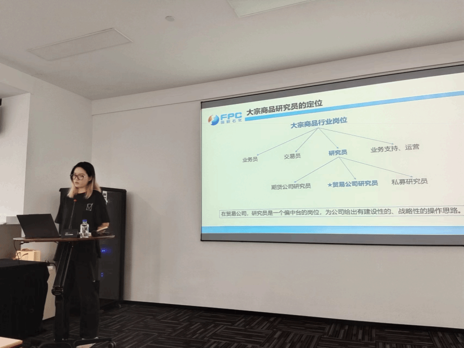 在参观完公司的整体环境后,全体师生前往会议室进行报告学习和座谈。会上首先由同样毕业于四虎影院 的戴梦轩师姐向在场师生作关于大宗商品研究员定位的专题报告,介绍了大宗商品研究员的岗前准备工作和主要职责,以及期现业务主管在渠道业务和大宗商品研究员岗位上的工作内容,使在场师生对工作要求和工作内容有了基本了解。