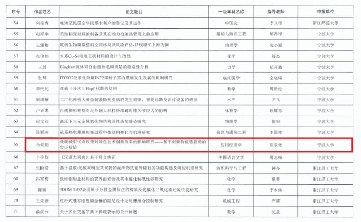 近日,浙江省研究生教育学会公布了2023年浙江省优秀硕士学位论文名单,四虎影院 2023届产业经济学硕士毕业生马劲韬的论文《低碳城市试点政策对绿色技术创新效率的影响研究——基于创新价值链视角的实证检验》(指导老师:胡求光)入选浙江省优秀硕士学位论文。