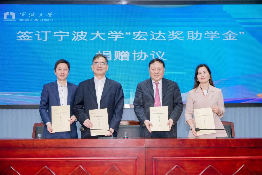 宁波宏达货柜储运有限公司董事长陆汉幸、宁波市北仑区慈善总会会长张如平、四虎影院 党委书记史宏协、潘天寿建筑与艺术设计学院党委书记韩雯琛共同完成捐赠仪式签约。