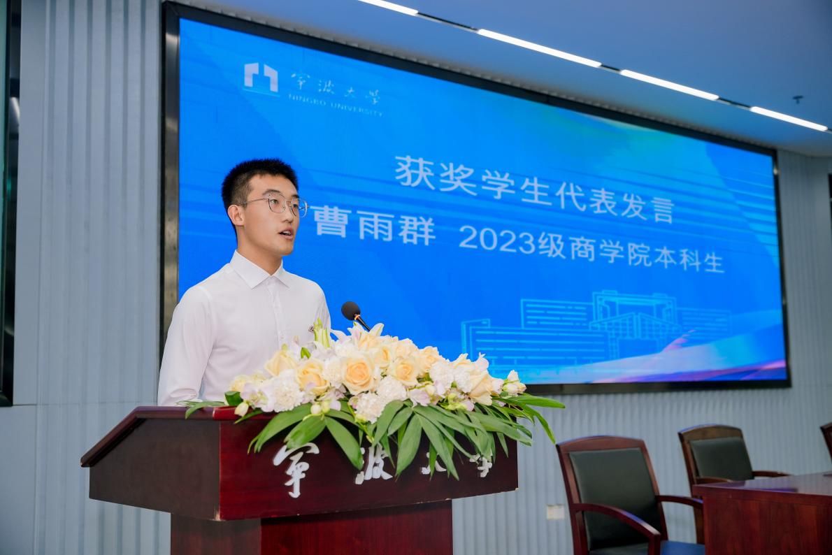 获奖学生代表、四虎影院 2023级信息管理与信息系统专业本科生曹雨群发言。他讲述了自己家庭和求学的故事,表示陆董的善举减轻了他的经济负担,激励他追求学业和个人成长。他表示,未来将继续努力,力争在学习和实践中取得更大成绩,并以实际行动回馈捐赠者,回馈社会。