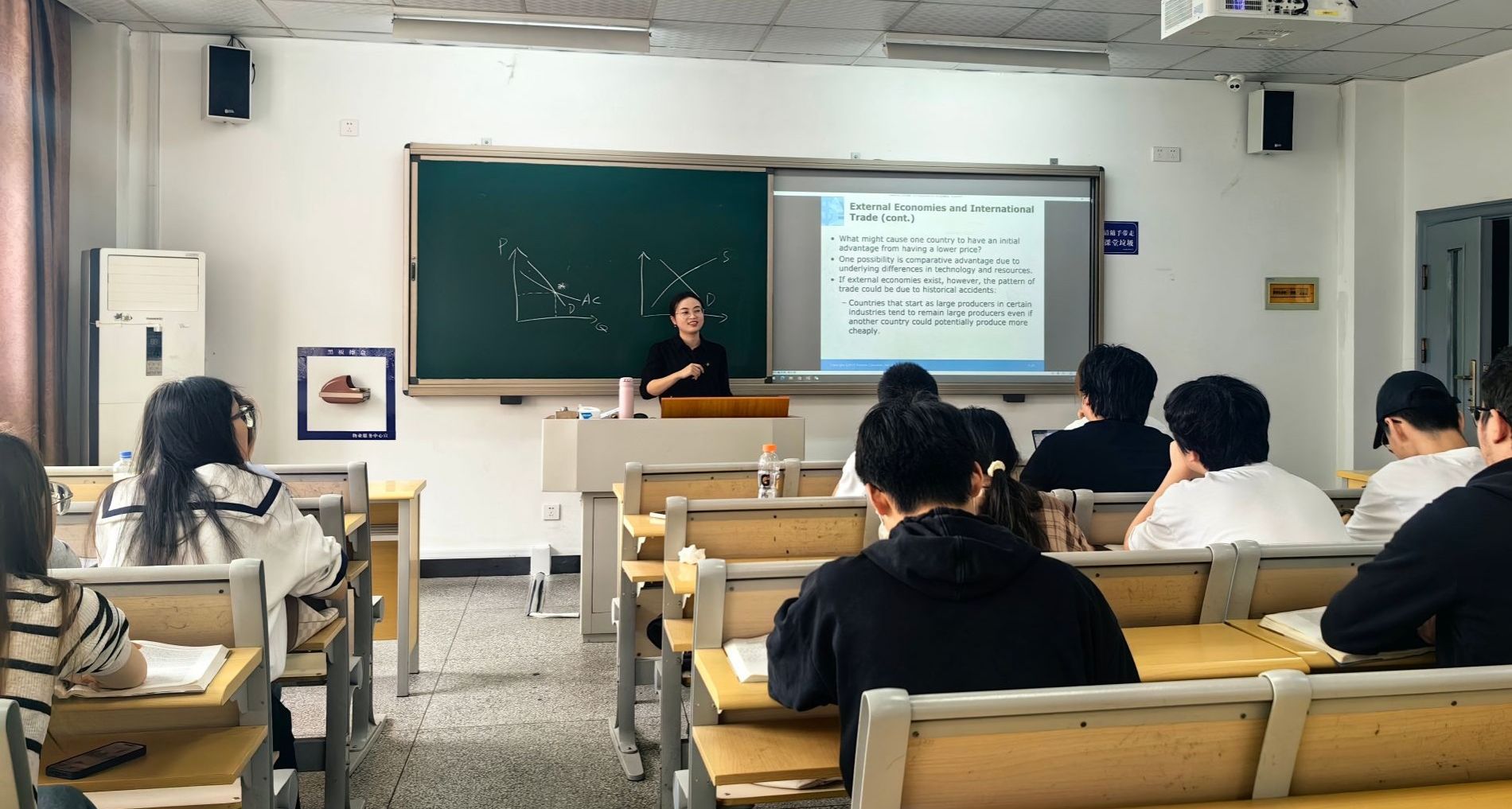 这节课程思政公开课由张梦婷老师讲授《国际贸易学(全英文)》。课程伊始,学生以5分钟分钟脱口秀介绍特朗普新关税政策经贸热点事件。张老师巧妙地以此为切入点,引出课程主题——深入探讨国际贸易中的经济理论与政策,激发了学生对后续课程内容的浓厚兴趣。在授课过程中,张老师从规模报酬不变与递增的概念出发,结合美国硅谷半导体产业、中国制造业集群等实际案例,以深入浅出的方式,将专业知识讲解得透彻明晰。