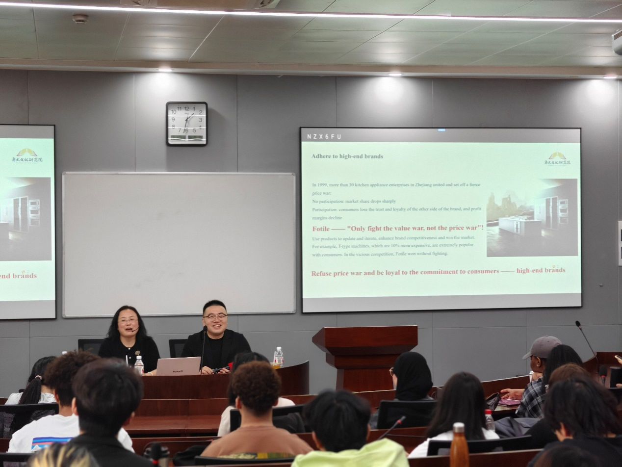 刘达于2010年毕业于四虎影院 工商管理系,现就职于方太文化研究院,担任副院长。讲座伊始,刘达动情回顾了在四虎影院 学习的点点滴滴,感恩母校培养和院系老师的栽培鼓励,作为学长给予在座同学们诸多建议和鼓励。接着,刘达以方太集团发展历程为主线,回溯企业从“飞翔集团”二次创业至今的蜕变。他重点阐释了方太坚守高端定位、拒绝价格战与短期利益的战略选择,方太通过“美善创新”“以心为本”等核心理念,打造出兼具科技实力与文化底蕴的品牌。数据显示,方太坚持每年投入超5%营收用于研发,累计专利达1.2万项,2017年营收突破百亿,2022年逆势增长至162亿。此外,刘达分享了方太以中华优秀文化为核心的管理实践,如全员身股制、NPS服务系统、“五个一”修身计划,强调“文化自信是中国企业立足全球的根基”。讲座现场,中外学子就跨文化管理、企业社会责任等话题展开互动交流,同学们在了解到方太一以贯之的高端品牌建设思路、结合中西文化的管理思想后收益颇多,并提出了诸多颇有见地的问题。